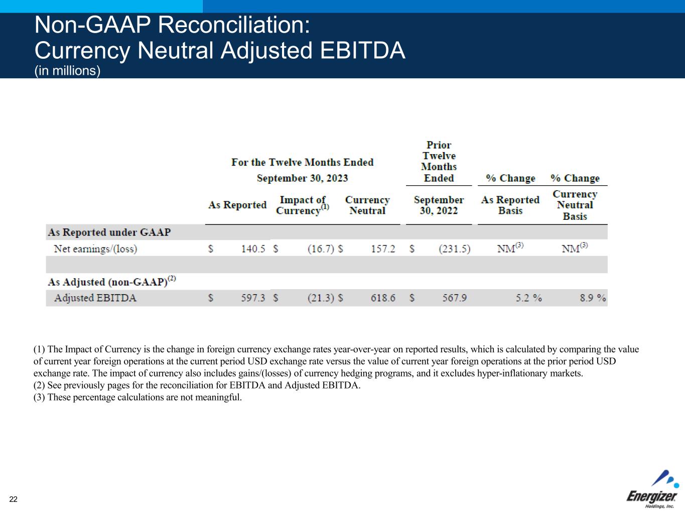 Non-GAAP Reconciliation: Currency Neutral Adjusted EBITDA (in millions) (1) The Impact of Currency is the change in foreign currency exchange rates year-over-year on reported results, which is calculated by comparing the value of current year foreign operations at the current period USD exchange rate versus the value of current year foreign operations at the prior period USD exchange rate. The impact of currency also includes gains/(losses) of currency hedging programs, and it excludes hyper-inflationary markets. (2) See previously pages for the reconciliation for EBITDA and Adjusted EBITDA. (3) These percentage calculations are not meaningful. 22