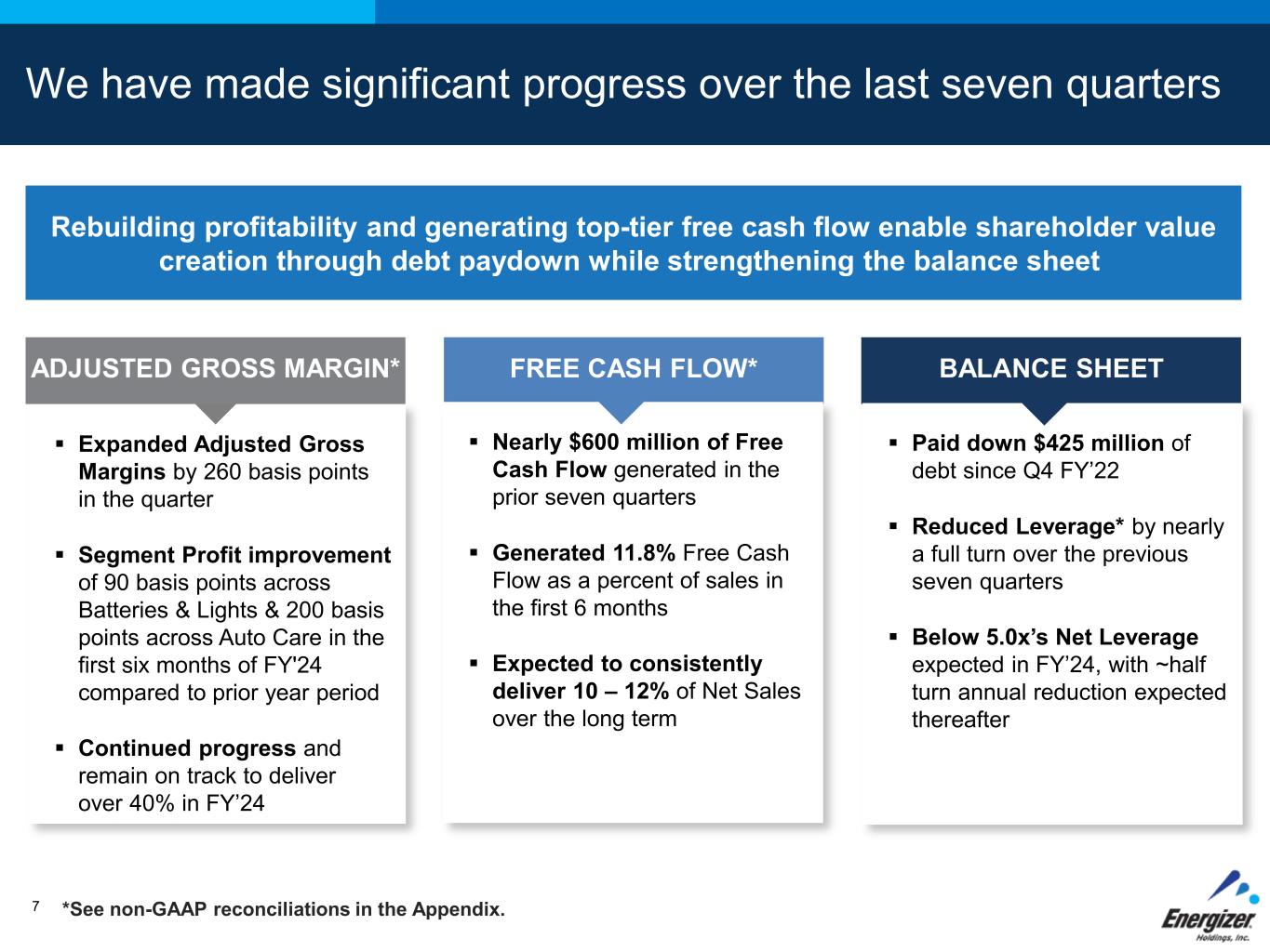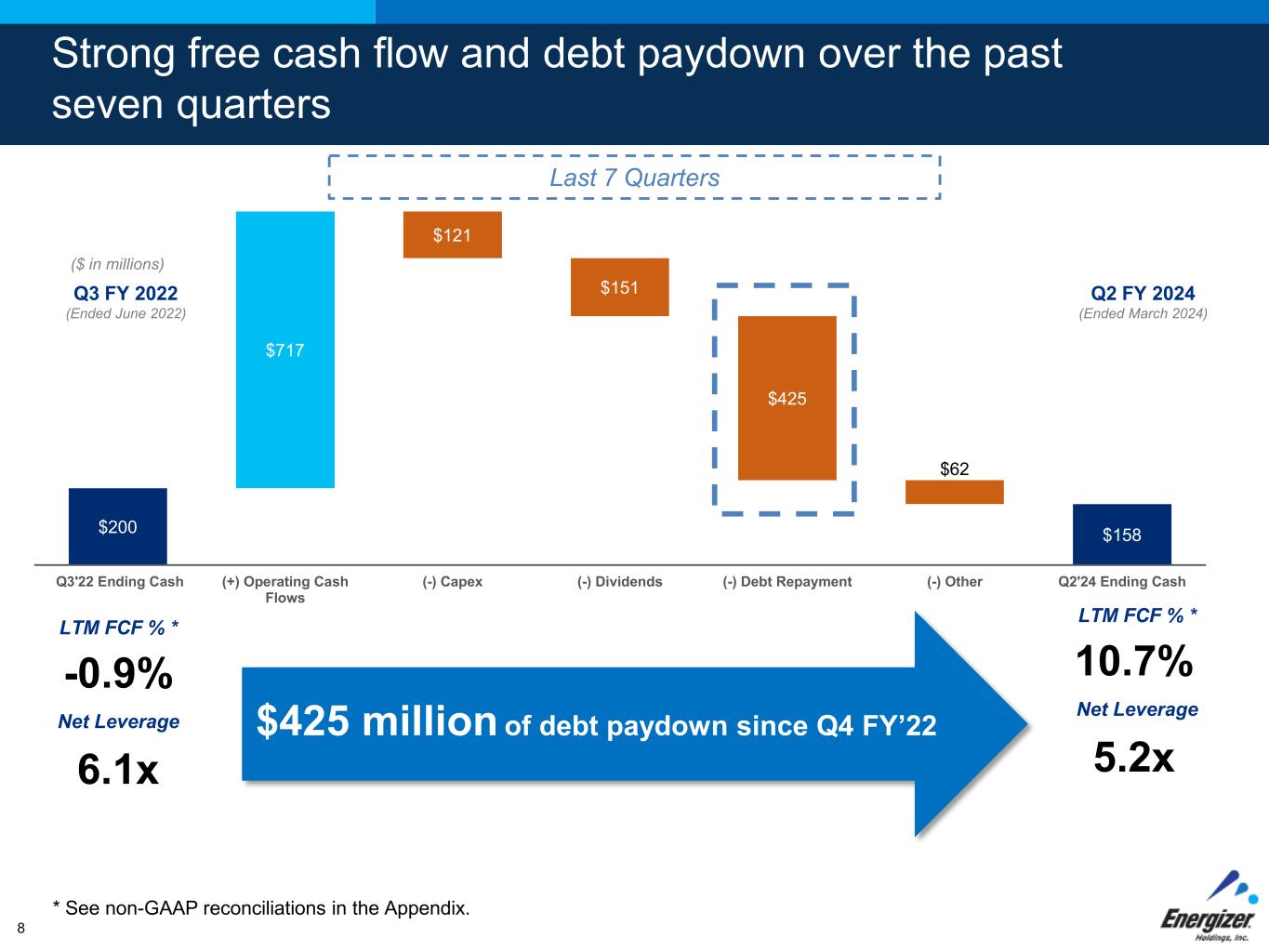 7 We have made significant progress over the last seven quarters  Expanded Adjusted Gross Margins by 260 basis points in the quarter  Segment Profit improvement of 90 basis points across Batteries & Lights & 200 basis points across Auto Care in the first six months of FY'24 compared to prior year period  Continued progress and remain on track to deliver over 40% in FY’24 ADJUSTED GROSS MARGIN* FREE CASH FLOW* BALANCE SHEET Rebuilding profitability and generating top-tier free cash flow enable shareholder value creation through debt paydown while strengthening the balance sheet  Nearly $600 million of Free Cash Flow generated in the prior seven quarters  Generated 11.8% Free Cash Flow as a percent of sales in the first 6 months  Expected to consistently deliver 10 – 12% of Net Sales over the long term  Paid down $425 million of debt since Q4 FY’22  Reduced Leverage* by nearly a full turn over the previous seven quarters  Below 5.0x’s Net Leverage expected in FY’24, with ~half turn annual reduction expected thereafter *See non-GAAP reconciliations in the Appendix.