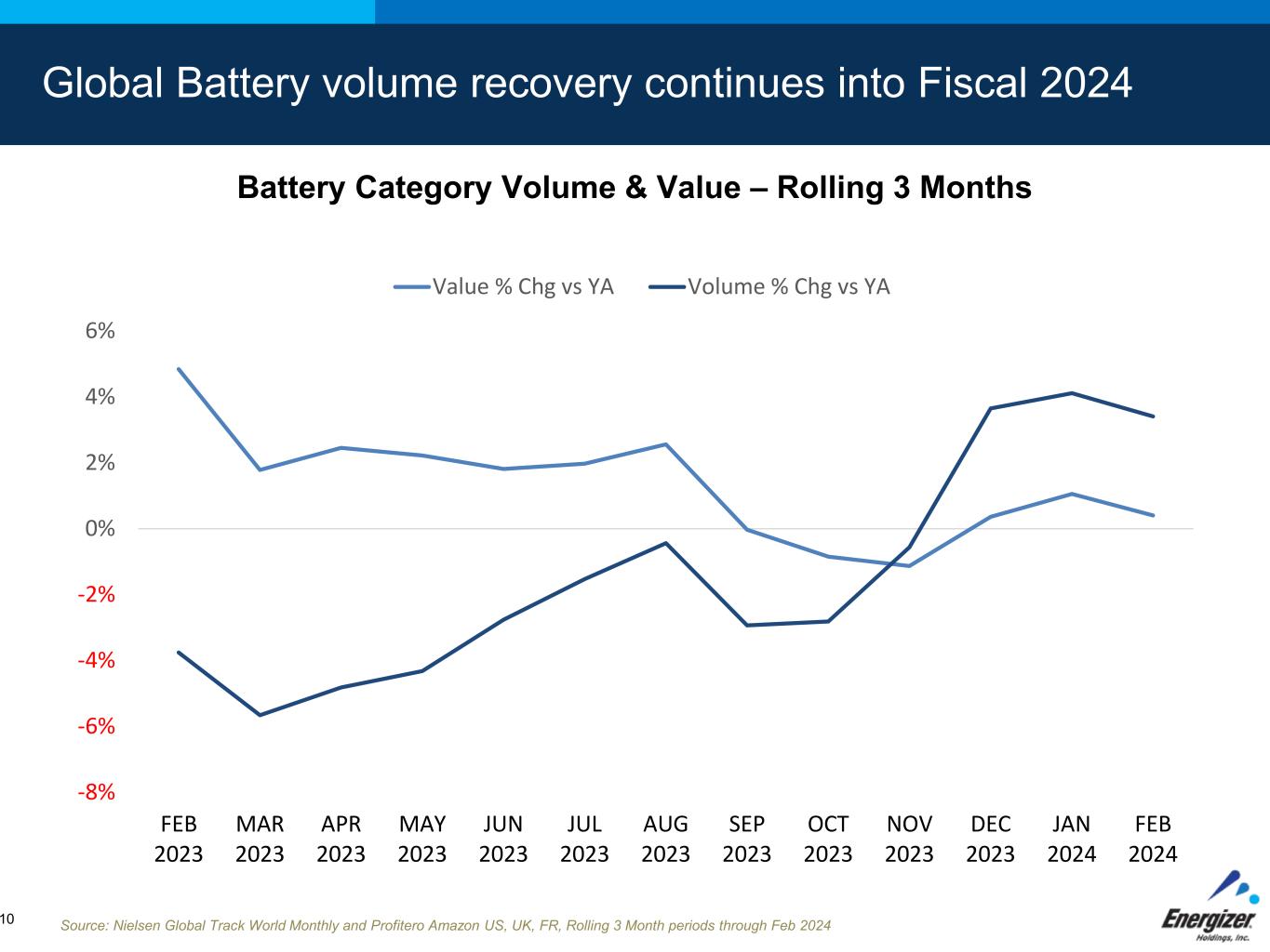 Source: Nielsen Global Track World Monthly and Profitero Amazon US, UK, FR, Rolling 3 Month periods through Feb 2024 -8% -6% -4% -2% 0% 2% 4% 6% FEB 2023 MAR 2023 APR 2023 MAY 2023 JUN 2023 JUL 2023 AUG 2023 SEP 2023 OCT 2023 NOV 2023 DEC 2023 JAN 2024 FEB 2024 Value % Chg vs YA Volume % Chg vs YA 10 Battery Category Volume & Value – Rolling 3 Months Global Battery volume recovery continues into Fiscal 2024
