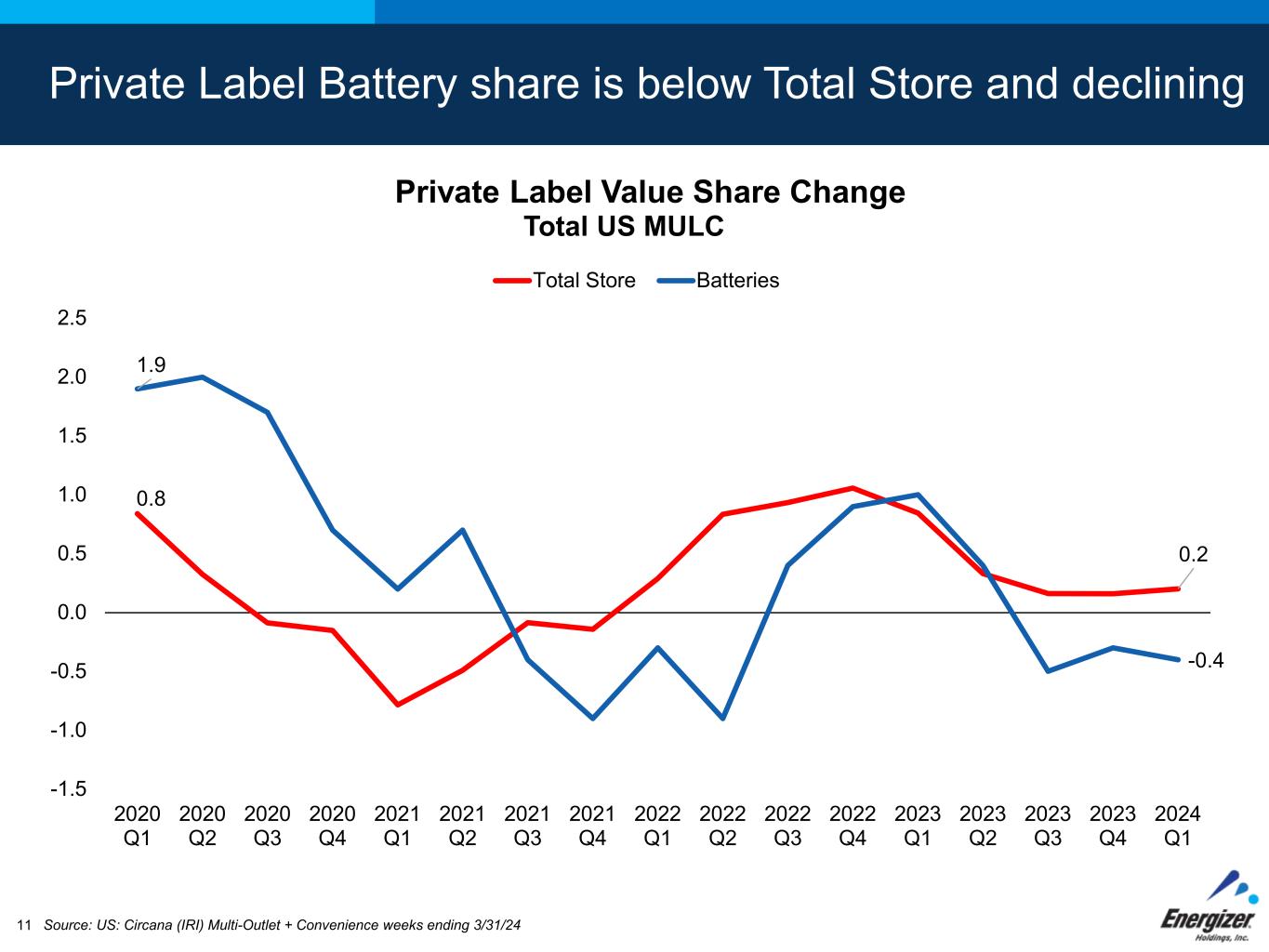 11 Private Label Battery share is below Total Store and declining 0.8 0.2 1.9 -0.4 -1.5 -1.0 -0.5 0.0 0.5 1.0 1.5 2.0 2.5 2020 Q1 2020 Q2 2020 Q3 2020 Q4 2021 Q1 2021 Q2 2021 Q3 2021 Q4 2022 Q1 2022 Q2 2022 Q3 2022 Q4 2023 Q1 2023 Q2 2023 Q3 2023 Q4 2024 Q1 Private Label Value Share Change Total US MULC Total Store Batteries Source: US: Circana (IRI) Multi-Outlet + Convenience weeks ending 3/31/24