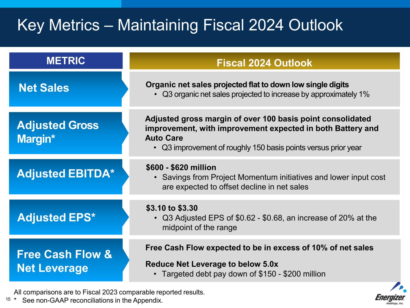 Key Metrics – Maintaining Fiscal 2024 Outlook METRIC Fiscal 2024 Outlook All comparisons are to Fiscal 2023 comparable reported results. * See non-GAAP reconciliations in the Appendix. Organic net sales projected flat to down low single digits • Q3 organic net sales projected to increase by approximately 1%Net Sales Adjusted Gross Margin* $3.10 to $3.30 • Q3 Adjusted EPS of $0.62 - $0.68, an increase of 20% at the midpoint of the range Free Cash Flow expected to be in excess of 10% of net sales Reduce Net Leverage to below 5.0x • Targeted debt pay down of $150 - $200 million 15 Free Cash Flow & Net Leverage Adjusted EPS* Adjusted EBITDA* $600 - $620 million • Savings from Project Momentum initiatives and lower input cost are expected to offset decline in net sales Adjusted gross margin of over 100 basis point consolidated improvement, with improvement expected in both Battery and Auto Care • Q3 improvement of roughly 150 basis points versus prior year