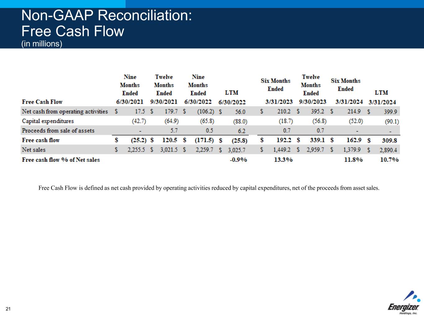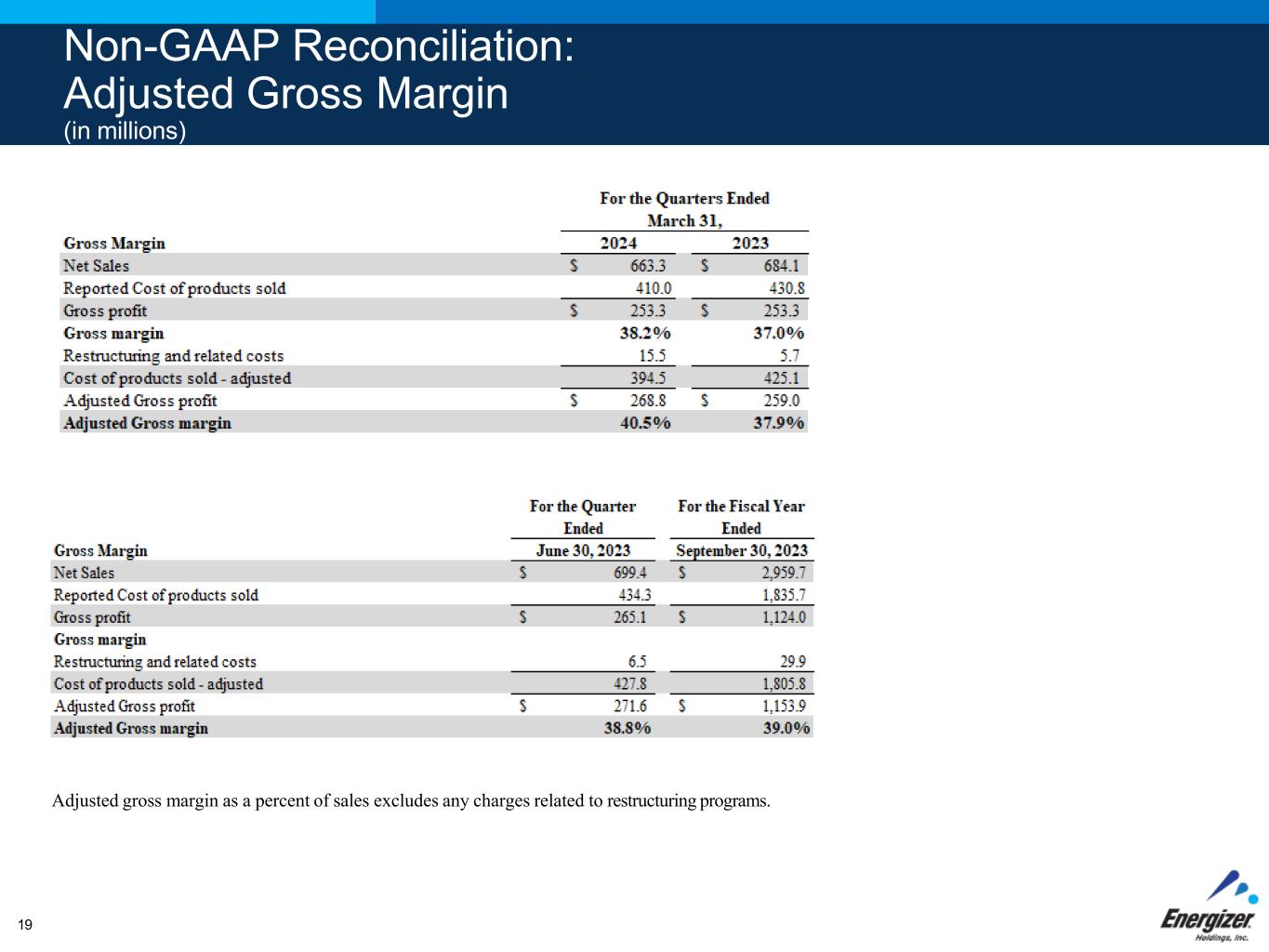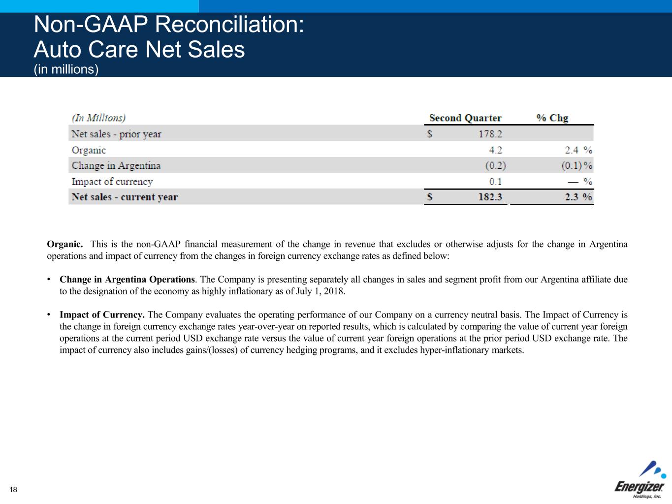 Non-GAAP Reconciliation: Auto Care Net Sales (in millions) Organic. This is the non-GAAP financial measurement of the change in revenue that excludes or otherwise adjusts for the change in Argentina operations and impact of currency from the changes in foreign currency exchange rates as defined below: • Change in Argentina Operations. The Company is presenting separately all changes in sales and segment profit from our Argentina affiliate due to the designation of the economy as highly inflationary as of July 1, 2018. • Impact of Currency. The Company evaluates the operating performance of our Company on a currency neutral basis. The Impact of Currency is the change in foreign currency exchange rates year-over-year on reported results, which is calculated by comparing the value of current year foreign operations at the current period USD exchange rate versus the value of current year foreign operations at the prior period USD exchange rate. The impact of currency also includes gains/(losses) of currency hedging programs, and it excludes hyper-inflationary markets. 18