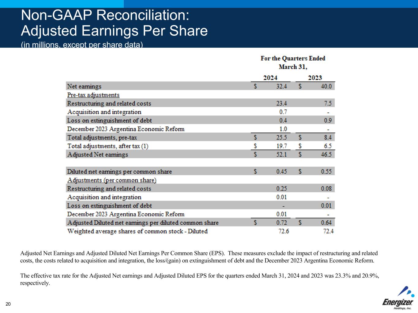 Non-GAAP Reconciliation: Adjusted Earnings Per Share (in millions, except per share data) Adjusted Net Earnings and Adjusted Diluted Net Earnings Per Common Share (EPS). These measures exclude the impact of restructuring and related costs, the costs related to acquisition and integration, the loss/(gain) on extinguishment of debt and the December 2023 Argentina Economic Reform. The effective tax rate for the Adjusted Net earnings and Adjusted Diluted EPS for the quarters ended March 31, 2024 and 2023 was 23.3% and 20.9%, respectively. 20