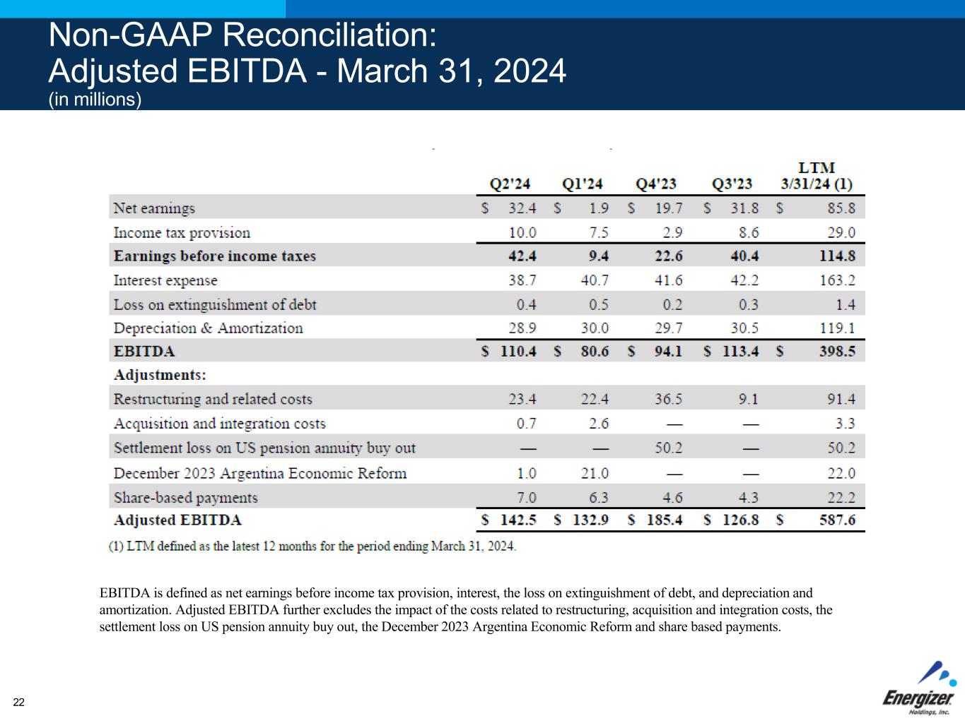 Non-GAAP Reconciliation: Adjusted EBITDA - March 31, 2024 (in millions) EBITDA is defined as net earnings before income tax provision, interest, the loss on extinguishment of debt, and depreciation and amortization. Adjusted EBITDA further excludes the impact of the costs related to restructuring, acquisition and integration costs, the settlement loss on US pension annuity buy out, the December 2023 Argentina Economic Reform and share based payments. 22