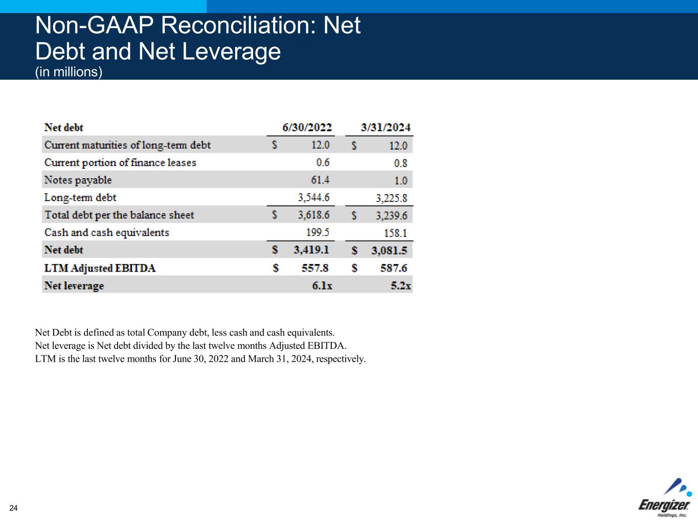 Non-GAAP Reconciliation: Net Debt and Net Leverage (in millions) Net Debt is defined as total Company debt, less cash and cash equivalents. Net leverage is Net debt divided by the last twelve months Adjusted EBITDA. LTM is the last twelve months for June 30, 2022 and March 31, 2024, respectively. 24