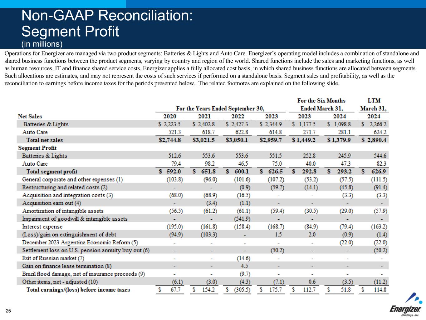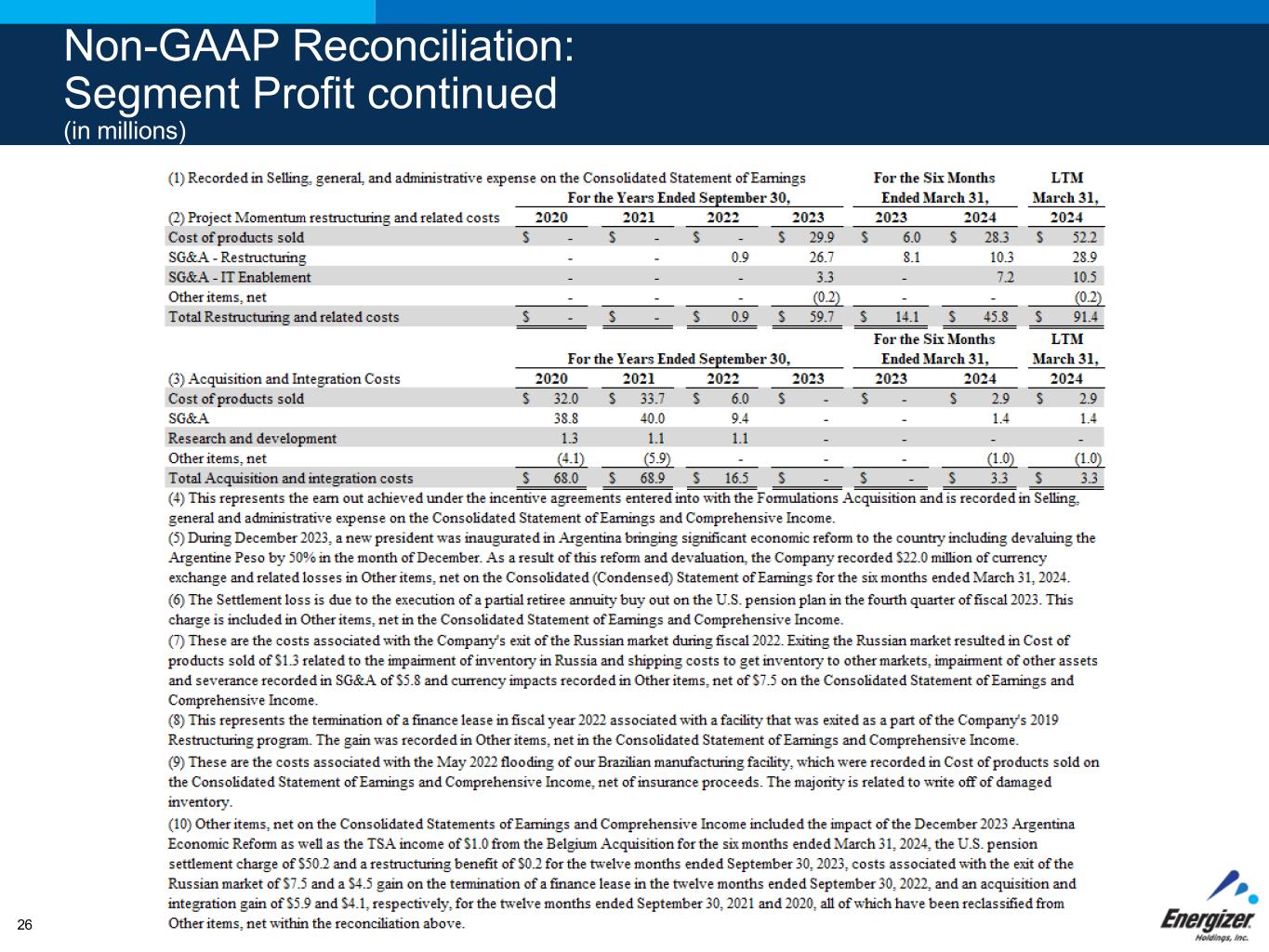 Non-GAAP Reconciliation: Segment Profit (in millions) 25 Operations for Energizer are managed via two product segments: Batteries & Lights and Auto Care. Energizer’s operating model includes a combination of standalone and shared business functions between the product segments, varying by country and region of the world. Shared functions include the sales and marketing functions, as well as human resources, IT and finance shared service costs. Energizer applies a fully allocated cost basis, in which shared business functions are allocated between segments. Such allocations are estimates, and may not represent the costs of such services if performed on a standalone basis. Segment sales and profitability, as well as the reconciliation to earnings before income taxes for the periods presented below. The related footnotes are explained on the following slide.