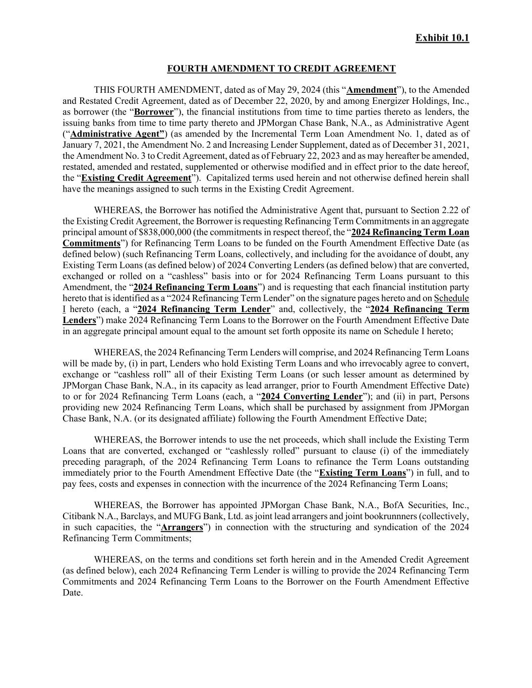 Exhibit 10.1 FOURTH AMENDMENT TO CREDIT AGREEMENT THIS FOURTH AMENDMENT, dated as of May 29, 2024 (this “Amendment”), to the Amended and Restated Credit Agreement, dated as of December 22, 2020, by and among Energizer Holdings, Inc., as borrower (the “Borrower”), the financial institutions from time to time parties thereto as lenders, the issuing banks from time to time party thereto and JPMorgan Chase Bank, N.A., as Administrative Agent (“Administrative Agent”) (as amended by the Incremental Term Loan Amendment No. 1, dated as of January 7, 2021, the Amendment No. 2 and Increasing Lender Supplement, dated as of December 31, 2021, the Amendment No. 3 to Credit Agreement, dated as of February 22, 2023 and as may hereafter be amended, restated, amended and restated, supplemented or otherwise modified and in effect prior to the date hereof, the “Existing Credit Agreement”). Capitalized terms used herein and not otherwise defined herein shall have the meanings assigned to such terms in the Existing Credit Agreement. WHEREAS, the Borrower has notified the Administrative Agent that, pursuant to Section 2.22 of the Existing Credit Agreement, the Borrower is requesting Refinancing Term Commitments in an aggregate principal amount of $838,000,000 (the commitments in respect thereof, the “2024 Refinancing Term Loan Commitments”) for Refinancing Term Loans to be funded on the Fourth Amendment Effective Date (as defined below) (such Refinancing Term Loans, collectively, and including for the avoidance of doubt, any Existing Term Loans (as defined below) of 2024 Converting Lenders (as defined below) that are converted, exchanged or rolled on a “cashless” basis into or for 2024 Refinancing Term Loans pursuant to this Amendment, the “2024 Refinancing Term Loans”) and is requesting that each financial institution party hereto that is identified as a “2024 Refinancing Term Lender” on the signature pages hereto and on Schedule I hereto (each, a “2024 Refinancing Term Lender” and, collectively, the “2024 Refinancing Term Lenders”) make 2024 Refinancing Term Loans to the Borrower on the Fourth Amendment Effective Date in an aggregate principal amount equal to the amount set forth opposite its name on Schedule I hereto; WHEREAS, the 2024 Refinancing Term Lenders will comprise, and 2024 Refinancing Term Loans will be made by, (i) in part, Lenders who hold Existing Term Loans and who irrevocably agree to convert, exchange or “cashless roll” all of their Existing Term Loans (or such lesser amount as determined by JPMorgan Chase Bank, N.A., in its capacity as lead arranger, prior to Fourth Amendment Effective Date) to or for 2024 Refinancing Term Loans (each, a “2024 Converting Lender”); and (ii) in part, Persons providing new 2024 Refinancing Term Loans, which shall be purchased by assignment from JPMorgan Chase Bank, N.A. (or its designated affiliate) following the Fourth Amendment Effective Date; WHEREAS, the Borrower intends to use the net proceeds, which shall include the Existing Term Loans that are converted, exchanged or “cashlessly rolled” pursuant to clause (i) of the immediately preceding paragraph, of the 2024 Refinancing Term Loans to refinance the Term Loans outstanding immediately prior to the Fourth Amendment Effective Date (the “Existing Term Loans”) in full, and to pay fees, costs and expenses in connection with the incurrence of the 2024 Refinancing Term Loans; WHEREAS, the Borrower has appointed JPMorgan Chase Bank, N.A., BofA Securities, Inc., Citibank N.A., Barclays, and MUFG Bank, Ltd. as joint lead arrangers and joint bookrunnners (collectively, in such capacities, the “Arrangers”) in connection with the structuring and syndication of the 2024 Refinancing Term Commitments; WHEREAS, on the terms and conditions set forth herein and in the Amended Credit Agreement (as defined below), each 2024 Refinancing Term Lender is willing to provide the 2024 Refinancing Term Commitments and 2024 Refinancing Term Loans to the Borrower on the Fourth Amendment Effective Date.