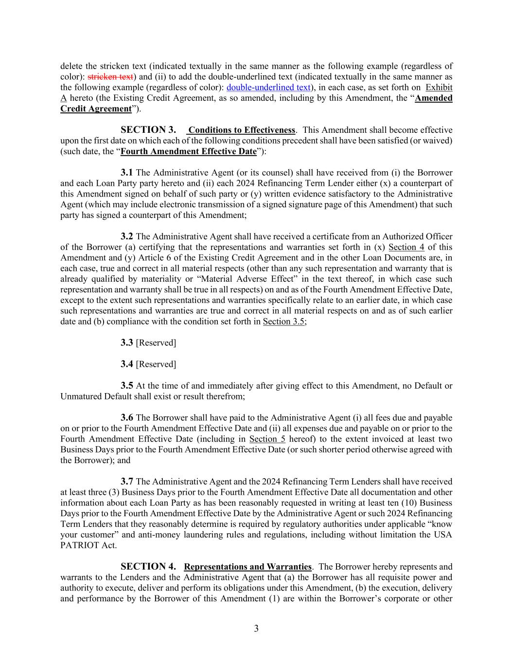 3 delete the stricken text (indicated textually in the same manner as the following example (regardless of color): stricken text) and (ii) to add the double-underlined text (indicated textually in the same manner as the following example (regardless of color): double-underlined text), in each case, as set forth on Exhibit A hereto (the Existing Credit Agreement, as so amended, including by this Amendment, the “Amended Credit Agreement”). SECTION 3. Conditions to Effectiveness. This Amendment shall become effective upon the first date on which each of the following conditions precedent shall have been satisfied (or waived) (such date, the “Fourth Amendment Effective Date”): 3.1 The Administrative Agent (or its counsel) shall have received from (i) the Borrower and each Loan Party party hereto and (ii) each 2024 Refinancing Term Lender either (x) a counterpart of this Amendment signed on behalf of such party or (y) written evidence satisfactory to the Administrative Agent (which may include electronic transmission of a signed signature page of this Amendment) that such party has signed a counterpart of this Amendment; 3.2 The Administrative Agent shall have received a certificate from an Authorized Officer of the Borrower (a) certifying that the representations and warranties set forth in (x) Section 4 of this Amendment and (y) Article 6 of the Existing Credit Agreement and in the other Loan Documents are, in each case, true and correct in all material respects (other than any such representation and warranty that is already qualified by materiality or “Material Adverse Effect” in the text thereof, in which case such representation and warranty shall be true in all respects) on and as of the Fourth Amendment Effective Date, except to the extent such representations and warranties specifically relate to an earlier date, in which case such representations and warranties are true and correct in all material respects on and as of such earlier date and (b) compliance with the condition set forth in Section 3.5; 3.3 [Reserved] 3.4 [Reserved] 3.5 At the time of and immediately after giving effect to this Amendment, no Default or Unmatured Default shall exist or result therefrom; 3.6 The Borrower shall have paid to the Administrative Agent (i) all fees due and payable on or prior to the Fourth Amendment Effective Date and (ii) all expenses due and payable on or prior to the Fourth Amendment Effective Date (including in Section 5 hereof) to the extent invoiced at least two Business Days prior to the Fourth Amendment Effective Date (or such shorter period otherwise agreed with the Borrower); and 3.7 The Administrative Agent and the 2024 Refinancing Term Lenders shall have received at least three (3) Business Days prior to the Fourth Amendment Effective Date all documentation and other information about each Loan Party as has been reasonably requested in writing at least ten (10) Business Days prior to the Fourth Amendment Effective Date by the Administrative Agent or such 2024 Refinancing Term Lenders that they reasonably determine is required by regulatory authorities under applicable “know your customer” and anti-money laundering rules and regulations, including without limitation the USA PATRIOT Act. SECTION 4. Representations and Warranties. The Borrower hereby represents and warrants to the Lenders and the Administrative Agent that (a) the Borrower has all requisite power and authority to execute, deliver and perform its obligations under this Amendment, (b) the execution, delivery and performance by the Borrower of this Amendment (1) are within the Borrower’s corporate or other