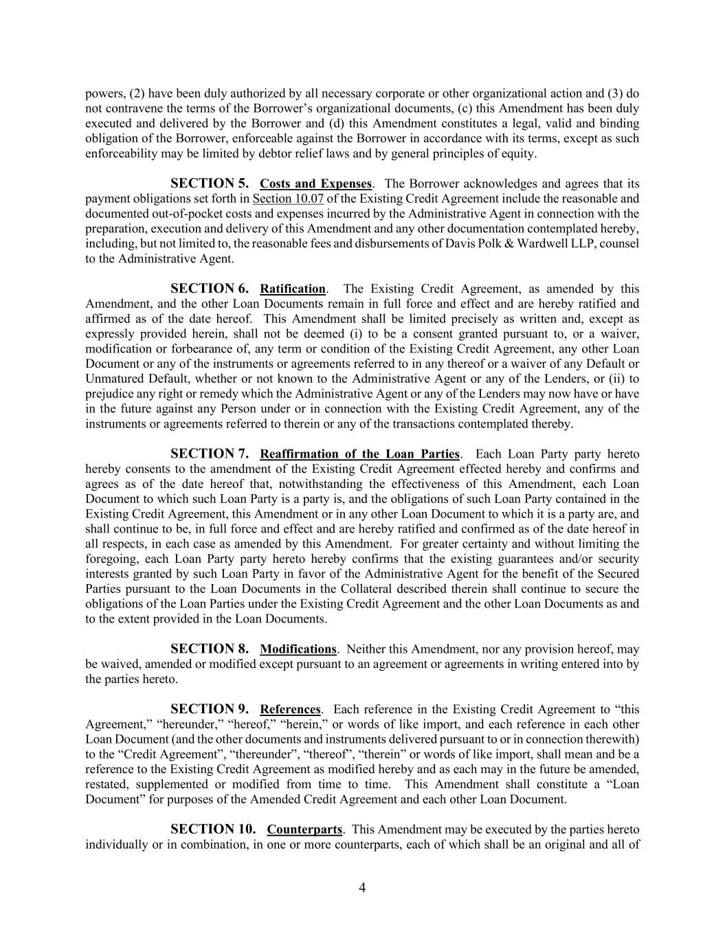 4 powers, (2) have been duly authorized by all necessary corporate or other organizational action and (3) do not contravene the terms of the Borrower’s organizational documents, (c) this Amendment has been duly executed and delivered by the Borrower and (d) this Amendment constitutes a legal, valid and binding obligation of the Borrower, enforceable against the Borrower in accordance with its terms, except as such enforceability may be limited by debtor relief laws and by general principles of equity. SECTION 5. Costs and Expenses. The Borrower acknowledges and agrees that its payment obligations set forth in Section 10.07 of the Existing Credit Agreement include the reasonable and documented out-of-pocket costs and expenses incurred by the Administrative Agent in connection with the preparation, execution and delivery of this Amendment and any other documentation contemplated hereby, including, but not limited to, the reasonable fees and disbursements of Davis Polk & Wardwell LLP, counsel to the Administrative Agent. SECTION 6. Ratification. The Existing Credit Agreement, as amended by this Amendment, and the other Loan Documents remain in full force and effect and are hereby ratified and affirmed as of the date hereof. This Amendment shall be limited precisely as written and, except as expressly provided herein, shall not be deemed (i) to be a consent granted pursuant to, or a waiver, modification or forbearance of, any term or condition of the Existing Credit Agreement, any other Loan Document or any of the instruments or agreements referred to in any thereof or a waiver of any Default or Unmatured Default, whether or not known to the Administrative Agent or any of the Lenders, or (ii) to prejudice any right or remedy which the Administrative Agent or any of the Lenders may now have or have in the future against any Person under or in connection with the Existing Credit Agreement, any of the instruments or agreements referred to therein or any of the transactions contemplated thereby. SECTION 7. Reaffirmation of the Loan Parties. Each Loan Party party hereto hereby consents to the amendment of the Existing Credit Agreement effected hereby and confirms and agrees as of the date hereof that, notwithstanding the effectiveness of this Amendment, each Loan Document to which such Loan Party is a party is, and the obligations of such Loan Party contained in the Existing Credit Agreement, this Amendment or in any other Loan Document to which it is a party are, and shall continue to be, in full force and effect and are hereby ratified and confirmed as of the date hereof in all respects, in each case as amended by this Amendment. For greater certainty and without limiting the foregoing, each Loan Party party hereto hereby confirms that the existing guarantees and/or security interests granted by such Loan Party in favor of the Administrative Agent for the benefit of the Secured Parties pursuant to the Loan Documents in the Collateral described therein shall continue to secure the obligations of the Loan Parties under the Existing Credit Agreement and the other Loan Documents as and to the extent provided in the Loan Documents. SECTION 8. Modifications. Neither this Amendment, nor any provision hereof, may be waived, amended or modified except pursuant to an agreement or agreements in writing entered into by the parties hereto. SECTION 9. References. Each reference in the Existing Credit Agreement to “this Agreement,” “hereunder,” “hereof,” “herein,” or words of like import, and each reference in each other Loan Document (and the other documents and instruments delivered pursuant to or in connection therewith) to the “Credit Agreement”, “thereunder”, “thereof”, “therein” or words of like import, shall mean and be a reference to the Existing Credit Agreement as modified hereby and as each may in the future be amended, restated, supplemented or modified from time to time. This Amendment shall constitute a “Loan Document” for purposes of the Amended Credit Agreement and each other Loan Document. SECTION 10. Counterparts. This Amendment may be executed by the parties hereto individually or in combination, in one or more counterparts, each of which shall be an original and all of