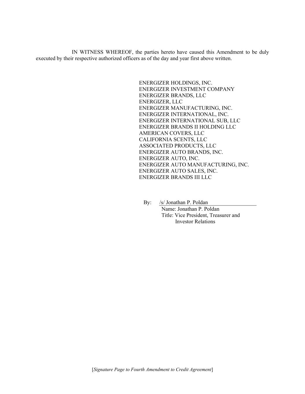 [Signature Page to Fourth Amendment to Credit Agreement] IN WITNESS WHEREOF, the parties hereto have caused this Amendment to be duly executed by their respective authorized officers as of the day and year first above written. ENERGIZER HOLDINGS, INC. ENERGIZER INVESTMENT COMPANY ENERGIZER BRANDS, LLC ENERGIZER, LLC ENERGIZER MANUFACTURING, INC. ENERGIZER INTERNATIONAL, INC. ENERGIZER INTERNATIONAL SUB, LLC ENERGIZER BRANDS II HOLDING LLC AMERICAN COVERS, LLC CALIFORNIA SCENTS, LLC ASSOCIATED PRODUCTS, LLC ENERGIZER AUTO BRANDS, INC. ENERGIZER AUTO, INC. ENERGIZER AUTO MANUFACTURING, INC. ENERGIZER AUTO SALES, INC. ENERGIZER BRANDS III LLC By: /s/ Jonathan P. Poldan Name: Jonathan P. Poldan Title: Vice President, Treasurer and Investor Relations