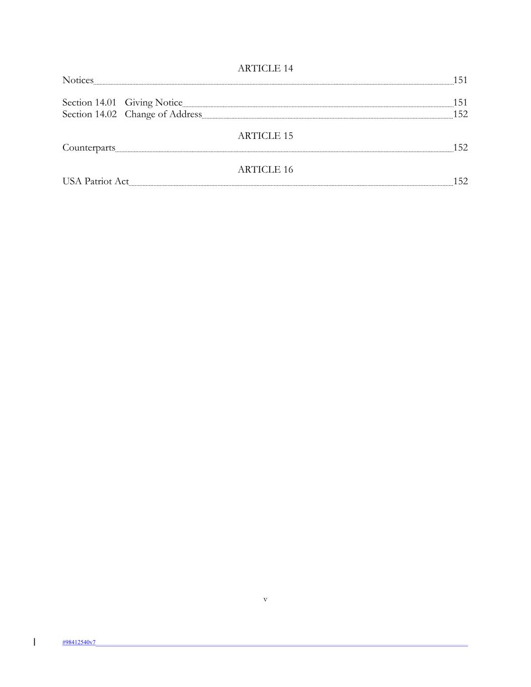 ARTICLE 14 Notices 151 Section 14.01 Giving Notice 151 Section 14.02 Change of Address 152 ARTICLE 15 Counterparts 152 ARTICLE 16 USA Patriot Act 152 v #98412540v7