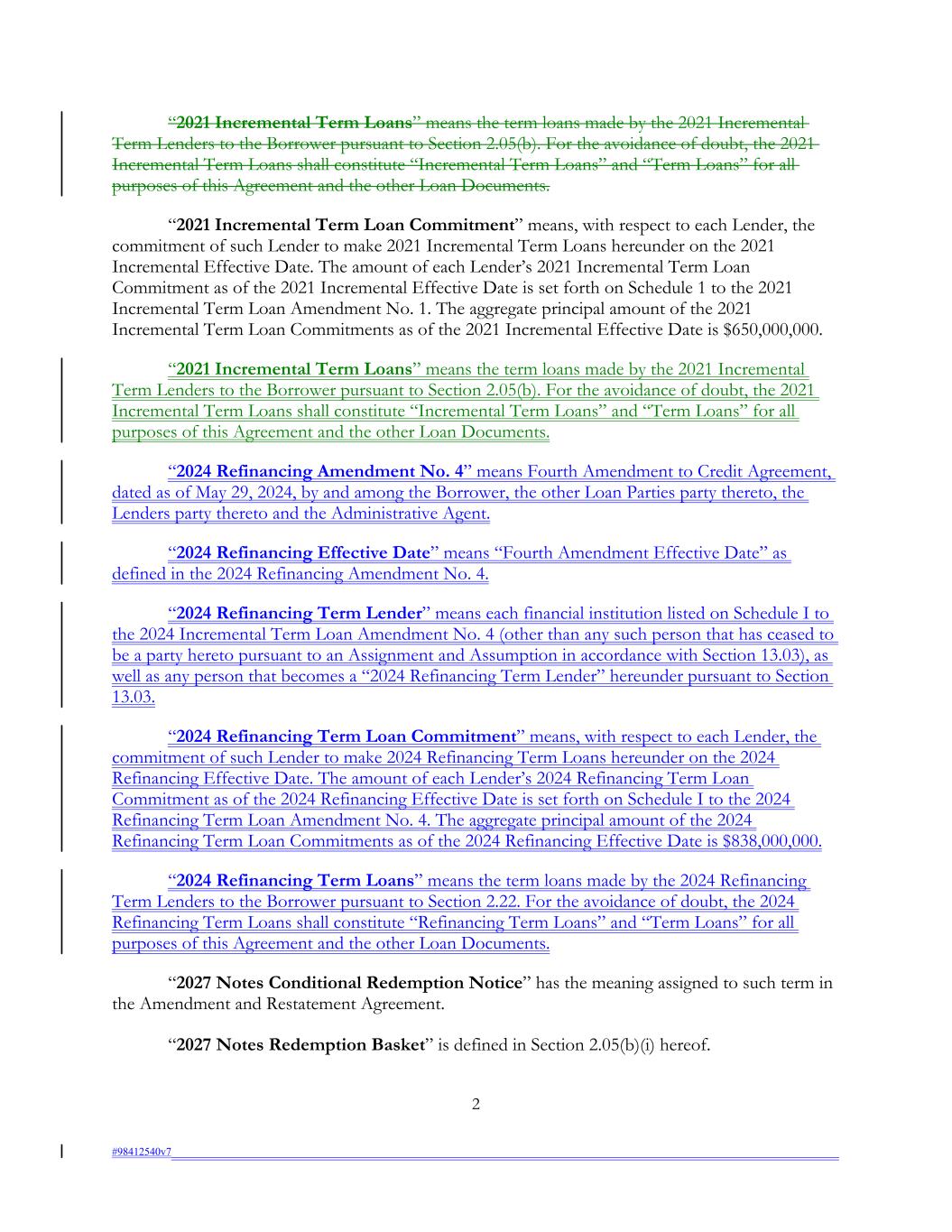 “2021 Incremental Term Loans” means the term loans made by the 2021 Incremental Term Lenders to the Borrower pursuant to Section 2.05(b). For the avoidance of doubt, the 2021 Incremental Term Loans shall constitute “Incremental Term Loans” and “Term Loans” for all purposes of this Agreement and the other Loan Documents. “2021 Incremental Term Loan Commitment” means, with respect to each Lender, the commitment of such Lender to make 2021 Incremental Term Loans hereunder on the 2021 Incremental Effective Date. The amount of each Lender’s 2021 Incremental Term Loan Commitment as of the 2021 Incremental Effective Date is set forth on Schedule 1 to the 2021 Incremental Term Loan Amendment No. 1. The aggregate principal amount of the 2021 Incremental Term Loan Commitments as of the 2021 Incremental Effective Date is $650,000,000. “2021 Incremental Term Loans” means the term loans made by the 2021 Incremental Term Lenders to the Borrower pursuant to Section 2.05(b). For the avoidance of doubt, the 2021 Incremental Term Loans shall constitute “Incremental Term Loans” and “Term Loans” for all purposes of this Agreement and the other Loan Documents. “2024 Refinancing Amendment No. 4” means Fourth Amendment to Credit Agreement, dated as of May 29, 2024, by and among the Borrower, the other Loan Parties party thereto, the Lenders party thereto and the Administrative Agent. “2024 Refinancing Effective Date” means “Fourth Amendment Effective Date” as defined in the 2024 Refinancing Amendment No. 4. “2024 Refinancing Term Lender” means each financial institution listed on Schedule I to the 2024 Incremental Term Loan Amendment No. 4 (other than any such person that has ceased to be a party hereto pursuant to an Assignment and Assumption in accordance with Section 13.03), as well as any person that becomes a “2024 Refinancing Term Lender” hereunder pursuant to Section 13.03. “2024 Refinancing Term Loan Commitment” means, with respect to each Lender, the commitment of such Lender to make 2024 Refinancing Term Loans hereunder on the 2024 Refinancing Effective Date. The amount of each Lender’s 2024 Refinancing Term Loan Commitment as of the 2024 Refinancing Effective Date is set forth on Schedule I to the 2024 Refinancing Term Loan Amendment No. 4. The aggregate principal amount of the 2024 Refinancing Term Loan Commitments as of the 2024 Refinancing Effective Date is $838,000,000. “2024 Refinancing Term Loans” means the term loans made by the 2024 Refinancing Term Lenders to the Borrower pursuant to Section 2.22. For the avoidance of doubt, the 2024 Refinancing Term Loans shall constitute “Refinancing Term Loans” and “Term Loans” for all purposes of this Agreement and the other Loan Documents. “2027 Notes Conditional Redemption Notice” has the meaning assigned to such term in the Amendment and Restatement Agreement. “2027 Notes Redemption Basket” is defined in Section 2.05(b)(i) hereof. 2 #98412540v7