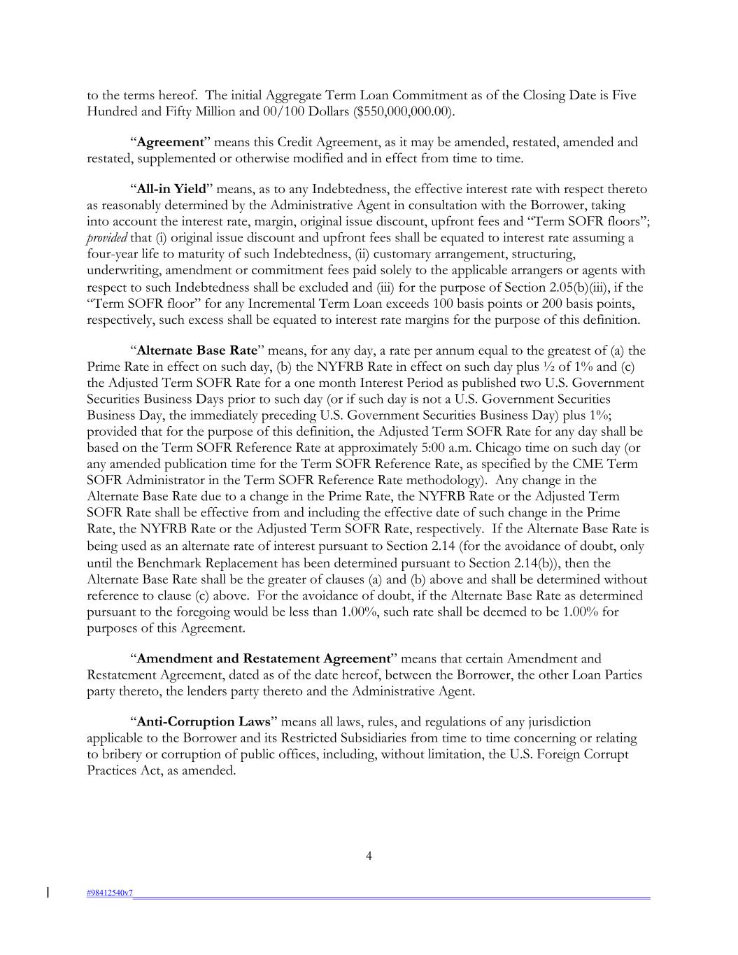 to the terms hereof. The initial Aggregate Term Loan Commitment as of the Closing Date is Five Hundred and Fifty Million and 00/100 Dollars ($550,000,000.00). “Agreement” means this Credit Agreement, as it may be amended, restated, amended and restated, supplemented or otherwise modified and in effect from time to time. “All-in Yield” means, as to any Indebtedness, the effective interest rate with respect thereto as reasonably determined by the Administrative Agent in consultation with the Borrower, taking into account the interest rate, margin, original issue discount, upfront fees and “Term SOFR floors”; provided that (i) original issue discount and upfront fees shall be equated to interest rate assuming a four-year life to maturity of such Indebtedness, (ii) customary arrangement, structuring, underwriting, amendment or commitment fees paid solely to the applicable arrangers or agents with respect to such Indebtedness shall be excluded and (iii) for the purpose of Section 2.05(b)(iii), if the “Term SOFR floor” for any Incremental Term Loan exceeds 100 basis points or 200 basis points, respectively, such excess shall be equated to interest rate margins for the purpose of this definition. “Alternate Base Rate” means, for any day, a rate per annum equal to the greatest of (a) the Prime Rate in effect on such day, (b) the NYFRB Rate in effect on such day plus ½ of 1% and (c) the Adjusted Term SOFR Rate for a one month Interest Period as published two U.S. Government Securities Business Days prior to such day (or if such day is not a U.S. Government Securities Business Day, the immediately preceding U.S. Government Securities Business Day) plus 1%; provided that for the purpose of this definition, the Adjusted Term SOFR Rate for any day shall be based on the Term SOFR Reference Rate at approximately 5:00 a.m. Chicago time on such day (or any amended publication time for the Term SOFR Reference Rate, as specified by the CME Term SOFR Administrator in the Term SOFR Reference Rate methodology). Any change in the Alternate Base Rate due to a change in the Prime Rate, the NYFRB Rate or the Adjusted Term SOFR Rate shall be effective from and including the effective date of such change in the Prime Rate, the NYFRB Rate or the Adjusted Term SOFR Rate, respectively. If the Alternate Base Rate is being used as an alternate rate of interest pursuant to Section 2.14 (for the avoidance of doubt, only until the Benchmark Replacement has been determined pursuant to Section 2.14(b)), then the Alternate Base Rate shall be the greater of clauses (a) and (b) above and shall be determined without reference to clause (c) above. For the avoidance of doubt, if the Alternate Base Rate as determined pursuant to the foregoing would be less than 1.00%, such rate shall be deemed to be 1.00% for purposes of this Agreement. “Amendment and Restatement Agreement” means that certain Amendment and Restatement Agreement, dated as of the date hereof, between the Borrower, the other Loan Parties party thereto, the lenders party thereto and the Administrative Agent. “Anti-Corruption Laws” means all laws, rules, and regulations of any jurisdiction applicable to the Borrower and its Restricted Subsidiaries from time to time concerning or relating to bribery or corruption of public offices, including, without limitation, the U.S. Foreign Corrupt Practices Act, as amended. 4 #98412540v7