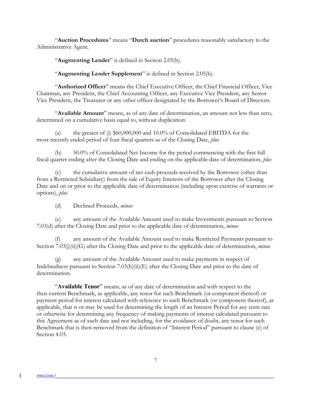 “Auction Procedures” means “Dutch auction” procedures reasonably satisfactory to the Administrative Agent. “Augmenting Lender” is defined in Section 2.05(b). “Augmenting Lender Supplement” is defined in Section 2.05(b). “Authorized Officer” means the Chief Executive Officer, the Chief Financial Officer, Vice Chairman, any President, the Chief Accounting Officer, any Executive Vice President, any Senior Vice President, the Treasurer or any other officer designated by the Borrower’s Board of Directors. “Available Amount” means, as of any date of determination, an amount not less than zero, determined on a cumulative basis equal to, without duplication: (a) the greater of (i) $60,000,000 and 10.0% of Consolidated EBITDA for the most-recently ended period of four fiscal quarters as of the Closing Date, plus (b) 50.0% of Consolidated Net Income for the period commencing with the first full fiscal quarter ending after the Closing Date and ending on the applicable date of determination, plus (c) the cumulative amount of net cash proceeds received by the Borrower (other than from a Restricted Subsidiary) from the sale of Equity Interests of the Borrower after the Closing Date and on or prior to the applicable date of determination (including upon exercise of warrants or options), plus (d) Declined Proceeds, minus (e) any amount of the Available Amount used to make Investments pursuant to Section 7.03(d) after the Closing Date and prior to the applicable date of determination, minus (f) any amount of the Available Amount used to make Restricted Payments pursuant to Section 7.03(j)(ii)(G) after the Closing Date and prior to the applicable date of determination, minus (g) any amount of the Available Amount used to make payments in respect of Indebtedness pursuant to Section 7.03(h)(ii)(E) after the Closing Date and prior to the date of determination. “Available Tenor” means, as of any date of determination and with respect to the then-current Benchmark, as applicable, any tenor for such Benchmark (or component thereof) or payment period for interest calculated with reference to such Benchmark (or component thereof), as applicable, that is or may be used for determining the length of an Interest Period for any term rate or otherwise for determining any frequency of making payments of interest calculated pursuant to this Agreement as of such date and not including, for the avoidance of doubt, any tenor for such Benchmark that is then-removed from the definition of “Interest Period” pursuant to clause (e) of Section 4.03. 7 #98412540v7
