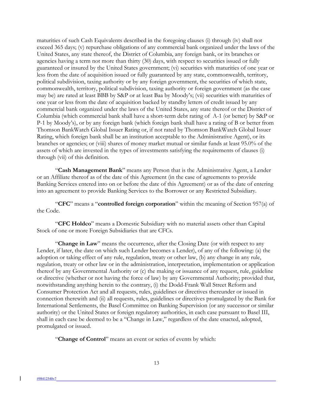 maturities of such Cash Equivalents described in the foregoing clauses (i) through (iv) shall not exceed 365 days; (v) repurchase obligations of any commercial bank organized under the laws of the United States, any state thereof, the District of Columbia, any foreign bank, or its branches or agencies having a term not more than thirty (30) days, with respect to securities issued or fully guaranteed or insured by the United States government; (vi) securities with maturities of one year or less from the date of acquisition issued or fully guaranteed by any state, commonwealth, territory, political subdivision, taxing authority or by any foreign government, the securities of which state, commonwealth, territory, political subdivision, taxing authority or foreign government (as the case may be) are rated at least BBB by S&P or at least Baa by Moody’s; (vii) securities with maturities of one year or less from the date of acquisition backed by standby letters of credit issued by any commercial bank organized under the laws of the United States, any state thereof or the District of Columbia (which commercial bank shall have a short-term debt rating of A-1 (or better) by S&P or P-1 by Moody’s), or by any foreign bank (which foreign bank shall have a rating of B or better from Thomson BankWatch Global Issuer Rating or, if not rated by Thomson BankWatch Global Issuer Rating, which foreign bank shall be an institution acceptable to the Administrative Agent), or its branches or agencies; or (viii) shares of money market mutual or similar funds at least 95.0% of the assets of which are invested in the types of investments satisfying the requirements of clauses (i) through (vii) of this definition. “Cash Management Bank” means any Person that is the Administrative Agent, a Lender or an Affiliate thereof as of the date of this Agreement (in the case of agreements to provide Banking Services entered into on or before the date of this Agreement) or as of the date of entering into an agreement to provide Banking Services to the Borrower or any Restricted Subsidiary. “CFC” means a “controlled foreign corporation” within the meaning of Section 957(a) of the Code. “CFC Holdco” means a Domestic Subsidiary with no material assets other than Capital Stock of one or more Foreign Subsidiaries that are CFCs. “Change in Law” means the occurrence, after the Closing Date (or with respect to any Lender, if later, the date on which such Lender becomes a Lender), of any of the following: (a) the adoption or taking effect of any rule, regulation, treaty or other law, (b) any change in any rule, regulation, treaty or other law or in the administration, interpretation, implementation or application thereof by any Governmental Authority or (c) the making or issuance of any request, rule, guideline or directive (whether or not having the force of law) by any Governmental Authority; provided that, notwithstanding anything herein to the contrary, (i) the Dodd-Frank Wall Street Reform and Consumer Protection Act and all requests, rules, guidelines or directives thereunder or issued in connection therewith and (ii) all requests, rules, guidelines or directives promulgated by the Bank for International Settlements, the Basel Committee on Banking Supervision (or any successor or similar authority) or the United States or foreign regulatory authorities, in each case pursuant to Basel III, shall in each case be deemed to be a “Change in Law,” regardless of the date enacted, adopted, promulgated or issued. “Change of Control” means an event or series of events by which: 13 #98412540v7