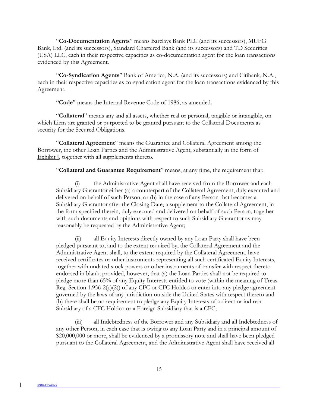 “Co-Documentation Agents” means Barclays Bank PLC (and its successors), MUFG Bank, Ltd. (and its successors), Standard Chartered Bank (and its successors) and TD Securities (USA) LLC, each in their respective capacities as co-documentation agent for the loan transactions evidenced by this Agreement. “Co-Syndication Agents” Bank of America, N.A. (and its successors) and Citibank, N.A., each in their respective capacities as co-syndication agent for the loan transactions evidenced by this Agreement. “Code” means the Internal Revenue Code of 1986, as amended. “Collateral” means any and all assets, whether real or personal, tangible or intangible, on which Liens are granted or purported to be granted pursuant to the Collateral Documents as security for the Secured Obligations. “Collateral Agreement” means the Guarantee and Collateral Agreement among the Borrower, the other Loan Parties and the Administrative Agent, substantially in the form of Exhibit J, together with all supplements thereto. “Collateral and Guarantee Requirement” means, at any time, the requirement that: (i) the Administrative Agent shall have received from the Borrower and each Subsidiary Guarantor either (a) a counterpart of the Collateral Agreement, duly executed and delivered on behalf of such Person, or (b) in the case of any Person that becomes a Subsidiary Guarantor after the Closing Date, a supplement to the Collateral Agreement, in the form specified therein, duly executed and delivered on behalf of such Person, together with such documents and opinions with respect to such Subsidiary Guarantor as may reasonably be requested by the Administrative Agent; (ii) all Equity Interests directly owned by any Loan Party shall have been pledged pursuant to, and to the extent required by, the Collateral Agreement and the Administrative Agent shall, to the extent required by the Collateral Agreement, have received certificates or other instruments representing all such certificated Equity Interests, together with undated stock powers or other instruments of transfer with respect thereto endorsed in blank; provided, however, that (a) the Loan Parties shall not be required to pledge more than 65% of any Equity Interests entitled to vote (within the meaning of Treas. Reg. Section 1.956-2(c)(2)) of any CFC or CFC Holdco or enter into any pledge agreement governed by the laws of any jurisdiction outside the United States with respect thereto and (b) there shall be no requirement to pledge any Equity Interests of a direct or indirect Subsidiary of a CFC Holdco or a Foreign Subsidiary that is a CFC; (iii) all Indebtedness of the Borrower and any Subsidiary and all Indebtedness of any other Person, in each case that is owing to any Loan Party and in a principal amount of $20,000,000 or more, shall be evidenced by a promissory note and shall have been pledged pursuant to the Collateral Agreement, and the Administrative Agent shall have received all 15 #98412540v7