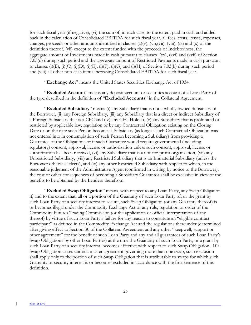 for such fiscal year (if negative), (vi) the sum of, in each case, to the extent paid in cash and added back in the calculation of Consolidated EBITDA for such fiscal year, all fees, costs, losses, expenses, charges, proceeds or other amounts identified in clauses (a)(v), (vi),(vii), (viii), (ix) and (x) of the definition thereof, (vii) except to the extent funded with the proceeds of Indebtedness, the aggregate amount of Investments made in cash pursuant to clauses (xv), (xvi) and (xvii) of Section 7.03(d) during such period and the aggregate amount of Restricted Payments made in cash pursuant to clauses (i)(B), (i)(C), (i)(D), (i)(E), (i)(F), (i)(G) and (i)(H) of Section 7.03(h) during such period and (viii) all other non-cash items increasing Consolidated EBITDA for such fiscal year. “Exchange Act” means the United States Securities Exchange Act of 1934. “Excluded Account” means any deposit account or securities account of a Loan Party of the type described in the definition of “Excluded Accounts” in the Collateral Agreement. “Excluded Subsidiary” means (i) any Subsidiary that is not a wholly owned Subsidiary of the Borrower, (ii) any Foreign Subsidiary, (iii) any Subsidiary that is a direct or indirect Subsidiary of a Foreign Subsidiary that is a CFC and (iv) any CFC Holdco, (v) any Subsidiary that is prohibited or restricted by applicable law, regulation or by any Contractual Obligation existing on the Closing Date or on the date such Person becomes a Subsidiary (as long as such Contractual Obligation was not entered into in contemplation of such Person becoming a Subsidiary) from providing a Guarantee of the Obligations or if such Guarantee would require governmental (including regulatory) consent, approval, license or authorization unless such consent, approval, license or authorization has been received, (vi) any Subsidiary that is a not-for-profit organization, (vii) any Unrestricted Subsidiary, (viii) any Restricted Subsidiary that is an Immaterial Subsidiary (unless the Borrower otherwise elects), and (ix) any other Restricted Subsidiary with respect to which, in the reasonable judgment of the Administrative Agent (confirmed in writing by notice to the Borrower), the cost or other consequences of becoming a Subsidiary Guarantor shall be excessive in view of the benefits to be obtained by the Lenders therefrom. “Excluded Swap Obligation” means, with respect to any Loan Party, any Swap Obligation if, and to the extent that, all or a portion of the Guaranty of such Loan Party of, or the grant by such Loan Party of a security interest to secure, such Swap Obligation (or any Guaranty thereof) is or becomes illegal under the Commodity Exchange Act or any rule, regulation or order of the Commodity Futures Trading Commission (or the application or official interpretation of any thereof) by virtue of such Loan Party’s failure for any reason to constitute an “eligible contract participant” as defined in the Commodity Exchange Act and the regulations thereunder (determined after giving effect to Section 30 of the Collateral Agreement and any other “keepwell, support or other agreement” for the benefit of such Loan Party and any and all guarantees of such Loan Party’s Swap Obligations by other Loan Parties) at the time the Guaranty of such Loan Party, or a grant by such Loan Party of a security interest, becomes effective with respect to such Swap Obligation. If a Swap Obligation arises under a master agreement governing more than one swap, such exclusion shall apply only to the portion of such Swap Obligation that is attributable to swaps for which such Guaranty or security interest is or becomes excluded in accordance with the first sentence of this definition. 26 #98412540v7