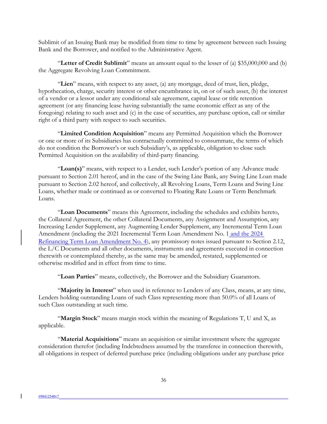 Sublimit of an Issuing Bank may be modified from time to time by agreement between such Issuing Bank and the Borrower, and notified to the Administrative Agent. “Letter of Credit Sublimit” means an amount equal to the lesser of (a) $35,000,000 and (b) the Aggregate Revolving Loan Commitment. “Lien” means, with respect to any asset, (a) any mortgage, deed of trust, lien, pledge, hypothecation, charge, security interest or other encumbrance in, on or of such asset, (b) the interest of a vendor or a lessor under any conditional sale agreement, capital lease or title retention agreement (or any financing lease having substantially the same economic effect as any of the foregoing) relating to such asset and (c) in the case of securities, any purchase option, call or similar right of a third party with respect to such securities. “Limited Condition Acquisition” means any Permitted Acquisition which the Borrower or one or more of its Subsidiaries has contractually committed to consummate, the terms of which do not condition the Borrower’s or such Subsidiary’s, as applicable, obligation to close such Permitted Acquisition on the availability of third-party financing. “Loan(s)” means, with respect to a Lender, such Lender’s portion of any Advance made pursuant to Section 2.01 hereof, and in the case of the Swing Line Bank, any Swing Line Loan made pursuant to Section 2.02 hereof, and collectively, all Revolving Loans, Term Loans and Swing Line Loans, whether made or continued as or converted to Floating Rate Loans or Term Benchmark Loans. “Loan Documents” means this Agreement, including the schedules and exhibits hereto, the Collateral Agreement, the other Collateral Documents, any Assignment and Assumption, any Increasing Lender Supplement, any Augmenting Lender Supplement, any Incremental Term Loan Amendment (including the 2021 Incremental Term Loan Amendment No. 1 and the 2024 Refinancing Term Loan Amendment No. 4), any promissory notes issued pursuant to Section 2.12, the L/C Documents and all other documents, instruments and agreements executed in connection therewith or contemplated thereby, as the same may be amended, restated, supplemented or otherwise modified and in effect from time to time. “Loan Parties” means, collectively, the Borrower and the Subsidiary Guarantors. “Majority in Interest” when used in reference to Lenders of any Class, means, at any time, Lenders holding outstanding Loans of such Class representing more than 50.0% of all Loans of such Class outstanding at such time. “Margin Stock” means margin stock within the meaning of Regulations T, U and X, as applicable. “Material Acquisitions” means an acquisition or similar investment where the aggregate consideration therefor (including Indebtedness assumed by the transferee in connection therewith, all obligations in respect of deferred purchase price (including obligations under any purchase price 36 #98412540v7