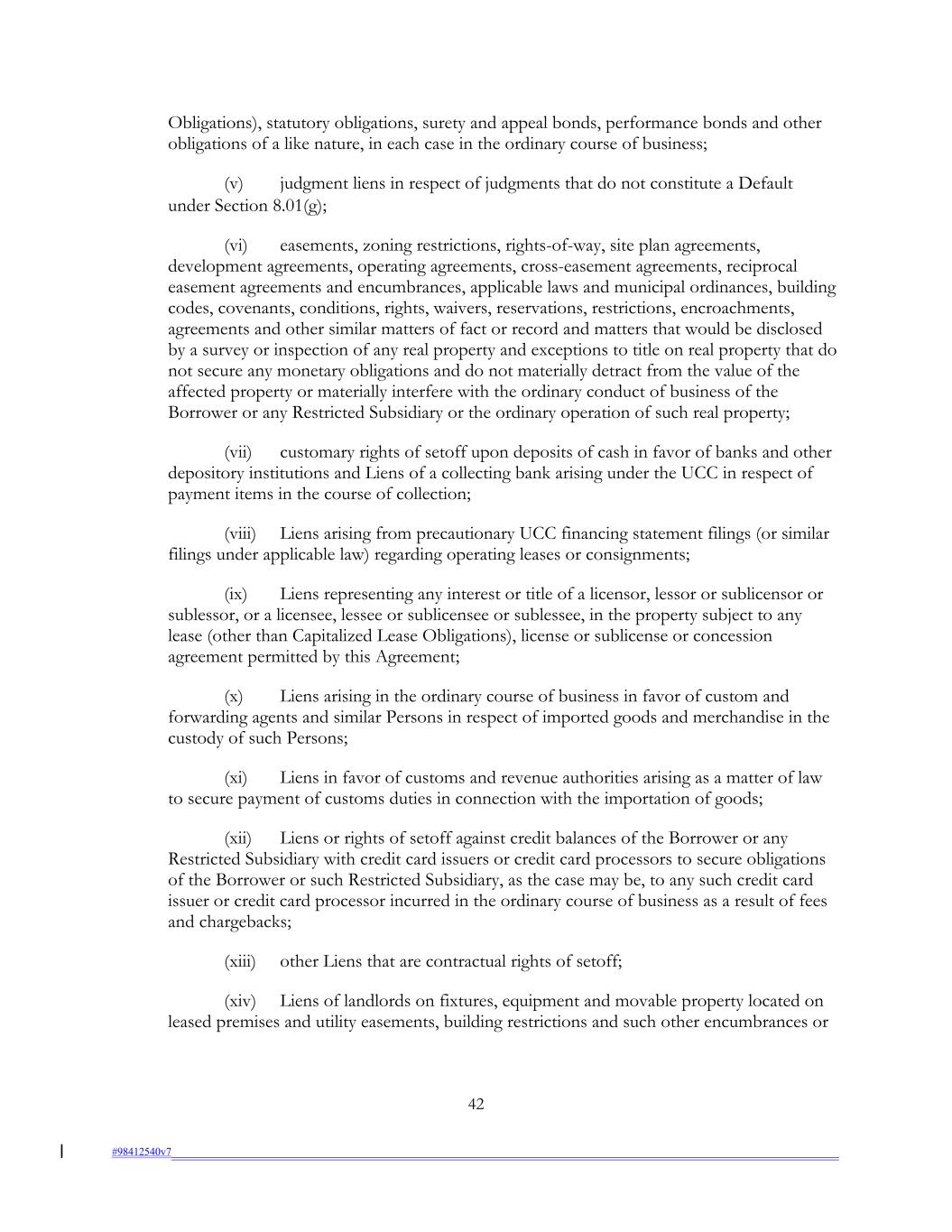 Obligations), statutory obligations, surety and appeal bonds, performance bonds and other obligations of a like nature, in each case in the ordinary course of business; (v) judgment liens in respect of judgments that do not constitute a Default under Section 8.01(g); (vi) easements, zoning restrictions, rights-of-way, site plan agreements, development agreements, operating agreements, cross-easement agreements, reciprocal easement agreements and encumbrances, applicable laws and municipal ordinances, building codes, covenants, conditions, rights, waivers, reservations, restrictions, encroachments, agreements and other similar matters of fact or record and matters that would be disclosed by a survey or inspection of any real property and exceptions to title on real property that do not secure any monetary obligations and do not materially detract from the value of the affected property or materially interfere with the ordinary conduct of business of the Borrower or any Restricted Subsidiary or the ordinary operation of such real property; (vii) customary rights of setoff upon deposits of cash in favor of banks and other depository institutions and Liens of a collecting bank arising under the UCC in respect of payment items in the course of collection; (viii) Liens arising from precautionary UCC financing statement filings (or similar filings under applicable law) regarding operating leases or consignments; (ix) Liens representing any interest or title of a licensor, lessor or sublicensor or sublessor, or a licensee, lessee or sublicensee or sublessee, in the property subject to any lease (other than Capitalized Lease Obligations), license or sublicense or concession agreement permitted by this Agreement; (x) Liens arising in the ordinary course of business in favor of custom and forwarding agents and similar Persons in respect of imported goods and merchandise in the custody of such Persons; (xi) Liens in favor of customs and revenue authorities arising as a matter of law to secure payment of customs duties in connection with the importation of goods; (xii) Liens or rights of setoff against credit balances of the Borrower or any Restricted Subsidiary with credit card issuers or credit card processors to secure obligations of the Borrower or such Restricted Subsidiary, as the case may be, to any such credit card issuer or credit card processor incurred in the ordinary course of business as a result of fees and chargebacks; (xiii) other Liens that are contractual rights of setoff; (xiv) Liens of landlords on fixtures, equipment and movable property located on leased premises and utility easements, building restrictions and such other encumbrances or 42 #98412540v7