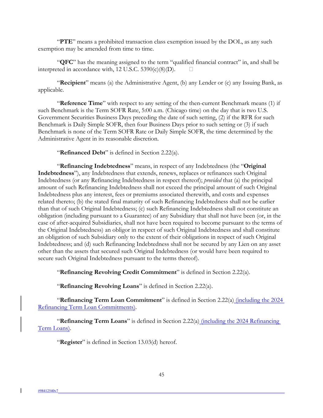 “PTE” means a prohibited transaction class exemption issued by the DOL, as any such exemption may be amended from time to time. “QFC” has the meaning assigned to the term “qualified financial contract” in, and shall be interpreted in accordance with, 12 U.S.C. 5390(c)(8)(D). � “Recipient” means (a) the Administrative Agent, (b) any Lender or (c) any Issuing Bank, as applicable. “Reference Time” with respect to any setting of the then-current Benchmark means (1) if such Benchmark is the Term SOFR Rate, 5:00 a.m. (Chicago time) on the day that is two U.S. Government Securities Business Days preceding the date of such setting, (2) if the RFR for such Benchmark is Daily Simple SOFR, then four Business Days prior to such setting or (3) if such Benchmark is none of the Term SOFR Rate or Daily Simple SOFR, the time determined by the Administrative Agent in its reasonable discretion. “Refinanced Debt” is defined in Section 2.22(a). “Refinancing Indebtedness” means, in respect of any Indebtedness (the “Original Indebtedness”), any Indebtedness that extends, renews, replaces or refinances such Original Indebtedness (or any Refinancing Indebtedness in respect thereof); provided that (a) the principal amount of such Refinancing Indebtedness shall not exceed the principal amount of such Original Indebtedness plus any interest, fees or premiums associated therewith, and costs and expenses related thereto; (b) the stated final maturity of such Refinancing Indebtedness shall not be earlier than that of such Original Indebtedness; (c) such Refinancing Indebtedness shall not constitute an obligation (including pursuant to a Guarantee) of any Subsidiary that shall not have been (or, in the case of after-acquired Subsidiaries, shall not have been required to become pursuant to the terms of the Original Indebtedness) an obligor in respect of such Original Indebtedness and shall constitute an obligation of such Subsidiary only to the extent of their obligations in respect of such Original Indebtedness; and (d) such Refinancing Indebtedness shall not be secured by any Lien on any asset other than the assets that secured such Original Indebtedness (or would have been required to secure such Original Indebtedness pursuant to the terms thereof). “Refinancing Revolving Credit Commitment” is defined in Section 2.22(a). “Refinancing Revolving Loans” is defined in Section 2.22(a). “Refinancing Term Loan Commitment” is defined in Section 2.22(a) (including the 2024 Refinancing Term Loan Commitments). “Refinancing Term Loans” is defined in Section 2.22(a) (including the 2024 Refinancing Term Loans). “Register” is defined in Section 13.03(d) hereof. 45 #98412540v7