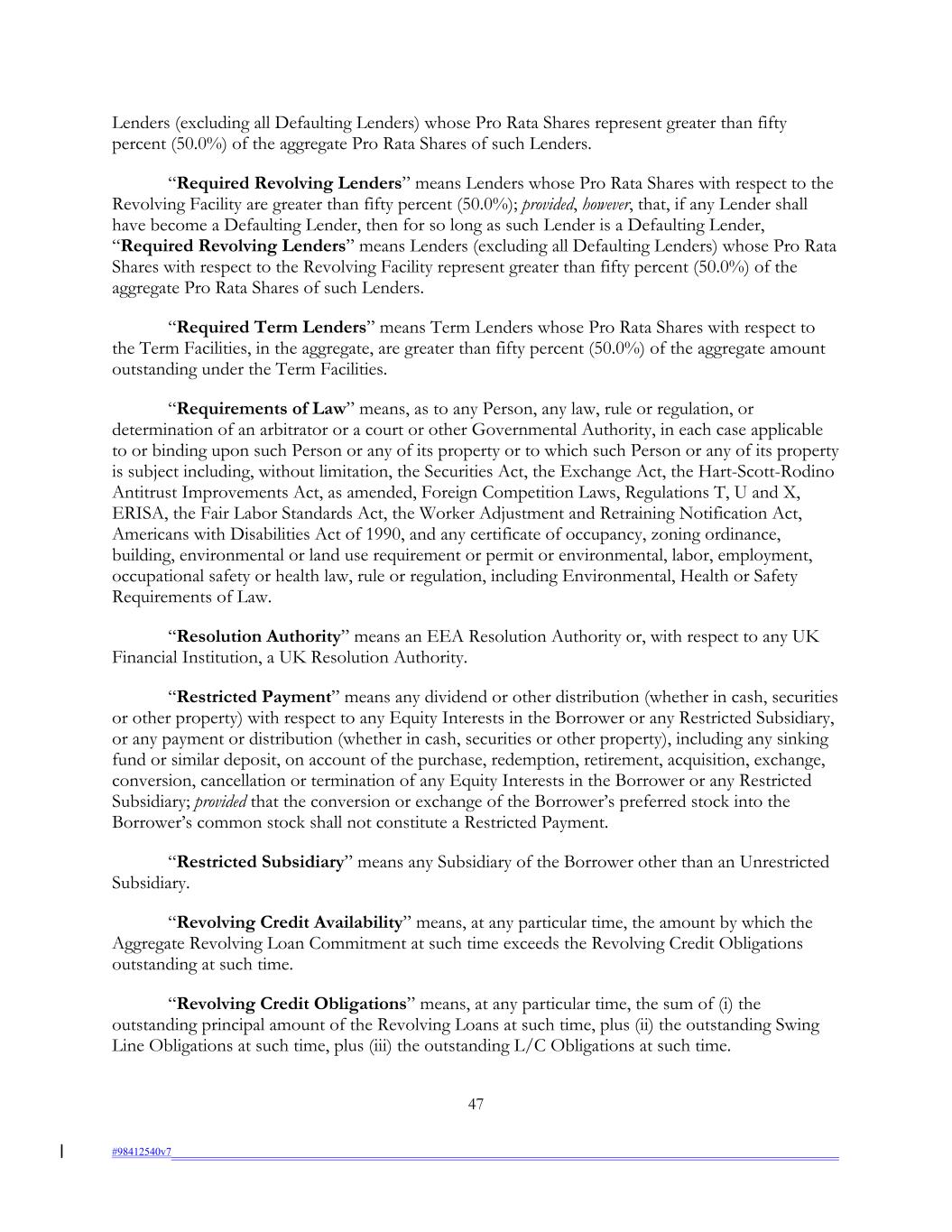 Lenders (excluding all Defaulting Lenders) whose Pro Rata Shares represent greater than fifty percent (50.0%) of the aggregate Pro Rata Shares of such Lenders. “Required Revolving Lenders” means Lenders whose Pro Rata Shares with respect to the Revolving Facility are greater than fifty percent (50.0%); provided, however, that, if any Lender shall have become a Defaulting Lender, then for so long as such Lender is a Defaulting Lender, “Required Revolving Lenders” means Lenders (excluding all Defaulting Lenders) whose Pro Rata Shares with respect to the Revolving Facility represent greater than fifty percent (50.0%) of the aggregate Pro Rata Shares of such Lenders. “Required Term Lenders” means Term Lenders whose Pro Rata Shares with respect to the Term Facilities, in the aggregate, are greater than fifty percent (50.0%) of the aggregate amount outstanding under the Term Facilities. “Requirements of Law” means, as to any Person, any law, rule or regulation, or determination of an arbitrator or a court or other Governmental Authority, in each case applicable to or binding upon such Person or any of its property or to which such Person or any of its property is subject including, without limitation, the Securities Act, the Exchange Act, the Hart-Scott-Rodino Antitrust Improvements Act, as amended, Foreign Competition Laws, Regulations T, U and X, ERISA, the Fair Labor Standards Act, the Worker Adjustment and Retraining Notification Act, Americans with Disabilities Act of 1990, and any certificate of occupancy, zoning ordinance, building, environmental or land use requirement or permit or environmental, labor, employment, occupational safety or health law, rule or regulation, including Environmental, Health or Safety Requirements of Law. “Resolution Authority” means an EEA Resolution Authority or, with respect to any UK Financial Institution, a UK Resolution Authority. “Restricted Payment” means any dividend or other distribution (whether in cash, securities or other property) with respect to any Equity Interests in the Borrower or any Restricted Subsidiary, or any payment or distribution (whether in cash, securities or other property), including any sinking fund or similar deposit, on account of the purchase, redemption, retirement, acquisition, exchange, conversion, cancellation or termination of any Equity Interests in the Borrower or any Restricted Subsidiary; provided that the conversion or exchange of the Borrower’s preferred stock into the Borrower’s common stock shall not constitute a Restricted Payment. “Restricted Subsidiary” means any Subsidiary of the Borrower other than an Unrestricted Subsidiary. “Revolving Credit Availability” means, at any particular time, the amount by which the Aggregate Revolving Loan Commitment at such time exceeds the Revolving Credit Obligations outstanding at such time. “Revolving Credit Obligations” means, at any particular time, the sum of (i) the outstanding principal amount of the Revolving Loans at such time, plus (ii) the outstanding Swing Line Obligations at such time, plus (iii) the outstanding L/C Obligations at such time. 47 #98412540v7