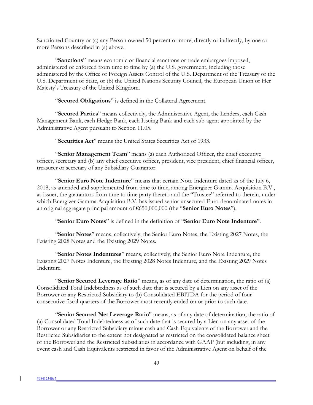 Sanctioned Country or (c) any Person owned 50 percent or more, directly or indirectly, by one or more Persons described in (a) above. “Sanctions” means economic or financial sanctions or trade embargoes imposed, administered or enforced from time to time by (a) the U.S. government, including those administered by the Office of Foreign Assets Control of the U.S. Department of the Treasury or the U.S. Department of State, or (b) the United Nations Security Council, the European Union or Her Majesty’s Treasury of the United Kingdom. “Secured Obligations” is defined in the Collateral Agreement. “Secured Parties” means collectively, the Administrative Agent, the Lenders, each Cash Management Bank, each Hedge Bank, each Issuing Bank and each sub-agent appointed by the Administrative Agent pursuant to Section 11.05. “Securities Act” means the United States Securities Act of 1933. “Senior Management Team” means (a) each Authorized Officer, the chief executive officer, secretary and (b) any chief executive officer, president, vice president, chief financial officer, treasurer or secretary of any Subsidiary Guarantor. “Senior Euro Note Indenture” means that certain Note Indenture dated as of the July 6, 2018, as amended and supplemented from time to time, among Energizer Gamma Acquisition B.V., as issuer, the guarantors from time to time party thereto and the “Trustee” referred to therein, under which Energizer Gamma Acquisition B.V. has issued senior unsecured Euro-denominated notes in an original aggregate principal amount of €650,000,000 (the “Senior Euro Notes”). “Senior Euro Notes” is defined in the definition of “Senior Euro Note Indenture”. “Senior Notes” means, collectively, the Senior Euro Notes, the Existing 2027 Notes, the Existing 2028 Notes and the Existing 2029 Notes. “Senior Notes Indentures” means, collectively, the Senior Euro Note Indenture, the Existing 2027 Notes Indenture, the Existing 2028 Notes Indenture, and the Existing 2029 Notes Indenture. “Senior Secured Leverage Ratio” means, as of any date of determination, the ratio of (a) Consolidated Total Indebtedness as of such date that is secured by a Lien on any asset of the Borrower or any Restricted Subsidiary to (b) Consolidated EBITDA for the period of four consecutive fiscal quarters of the Borrower most recently ended on or prior to such date. “Senior Secured Net Leverage Ratio” means, as of any date of determination, the ratio of (a) Consolidated Total Indebtedness as of such date that is secured by a Lien on any asset of the Borrower or any Restricted Subsidiary minus cash and Cash Equivalents of the Borrower and the Restricted Subsidiaries to the extent not designated as restricted on the consolidated balance sheet of the Borrower and the Restricted Subsidiaries in accordance with GAAP (but including, in any event cash and Cash Equivalents restricted in favor of the Administrative Agent on behalf of the 49 #98412540v7