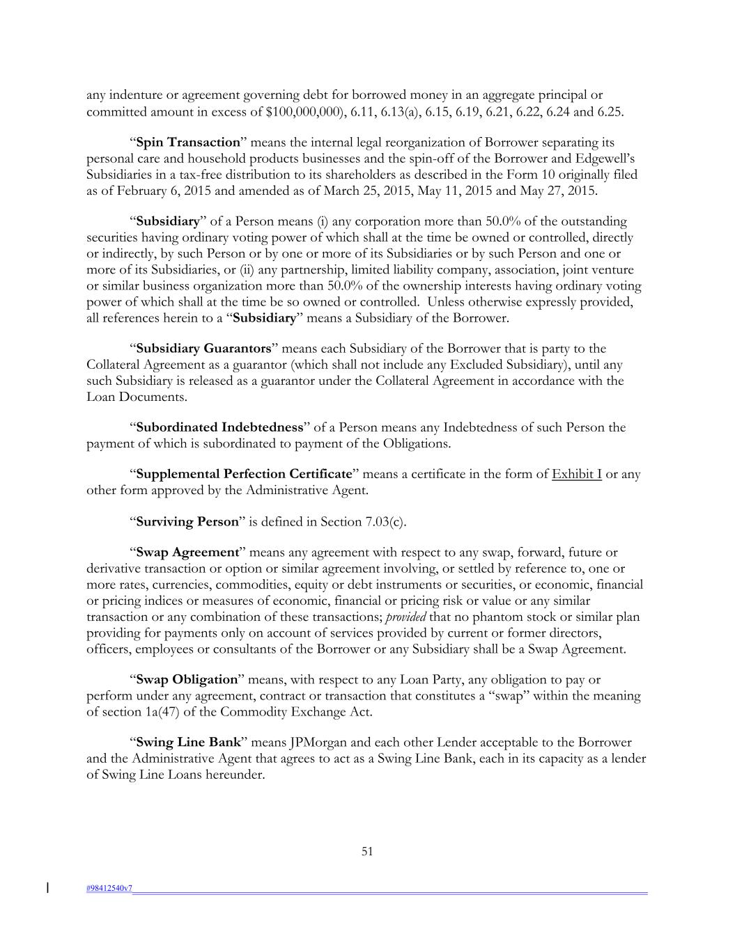 any indenture or agreement governing debt for borrowed money in an aggregate principal or committed amount in excess of $100,000,000), 6.11, 6.13(a), 6.15, 6.19, 6.21, 6.22, 6.24 and 6.25. “Spin Transaction” means the internal legal reorganization of Borrower separating its personal care and household products businesses and the spin-off of the Borrower and Edgewell’s Subsidiaries in a tax-free distribution to its shareholders as described in the Form 10 originally filed as of February 6, 2015 and amended as of March 25, 2015, May 11, 2015 and May 27, 2015. “Subsidiary” of a Person means (i) any corporation more than 50.0% of the outstanding securities having ordinary voting power of which shall at the time be owned or controlled, directly or indirectly, by such Person or by one or more of its Subsidiaries or by such Person and one or more of its Subsidiaries, or (ii) any partnership, limited liability company, association, joint venture or similar business organization more than 50.0% of the ownership interests having ordinary voting power of which shall at the time be so owned or controlled. Unless otherwise expressly provided, all references herein to a “Subsidiary” means a Subsidiary of the Borrower. “Subsidiary Guarantors” means each Subsidiary of the Borrower that is party to the Collateral Agreement as a guarantor (which shall not include any Excluded Subsidiary), until any such Subsidiary is released as a guarantor under the Collateral Agreement in accordance with the Loan Documents. “Subordinated Indebtedness” of a Person means any Indebtedness of such Person the payment of which is subordinated to payment of the Obligations. “Supplemental Perfection Certificate” means a certificate in the form of Exhibit I or any other form approved by the Administrative Agent. “Surviving Person” is defined in Section 7.03(c). “Swap Agreement” means any agreement with respect to any swap, forward, future or derivative transaction or option or similar agreement involving, or settled by reference to, one or more rates, currencies, commodities, equity or debt instruments or securities, or economic, financial or pricing indices or measures of economic, financial or pricing risk or value or any similar transaction or any combination of these transactions; provided that no phantom stock or similar plan providing for payments only on account of services provided by current or former directors, officers, employees or consultants of the Borrower or any Subsidiary shall be a Swap Agreement. “Swap Obligation” means, with respect to any Loan Party, any obligation to pay or perform under any agreement, contract or transaction that constitutes a “swap” within the meaning of section 1a(47) of the Commodity Exchange Act. “Swing Line Bank” means JPMorgan and each other Lender acceptable to the Borrower and the Administrative Agent that agrees to act as a Swing Line Bank, each in its capacity as a lender of Swing Line Loans hereunder. 51 #98412540v7