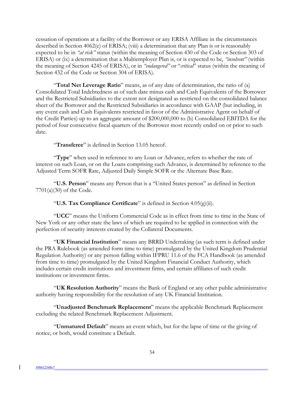 cessation of operations at a facility of the Borrower or any ERISA Affiliate in the circumstances described in Section 4062(e) of ERISA; (viii) a determination that any Plan is or is reasonably expected to be in “at risk” status (within the meaning of Section 430 of the Code or Section 303 of ERISA) or (ix) a determination that a Multiemployer Plan is, or is expected to be, “insolvent” (within the meaning of Section 4245 of ERISA), or in “endangered” or “critical” status (within the meaning of Section 432 of the Code or Section 304 of ERISA). “Total Net Leverage Ratio” means, as of any date of determination, the ratio of (a) Consolidated Total Indebtedness as of such date minus cash and Cash Equivalents of the Borrower and the Restricted Subsidiaries to the extent not designated as restricted on the consolidated balance sheet of the Borrower and the Restricted Subsidiaries in accordance with GAAP (but including, in any event cash and Cash Equivalents restricted in favor of the Administrative Agent on behalf of the Credit Parties) up to an aggregate amount of $200,000,000 to (b) Consolidated EBITDA for the period of four consecutive fiscal quarters of the Borrower most recently ended on or prior to such date. “Transferee” is defined in Section 13.05 hereof. “Type” when used in reference to any Loan or Advance, refers to whether the rate of interest on such Loan, or on the Loans comprising such Advance, is determined by reference to the Adjusted Term SOFR Rate, Adjusted Daily Simple SOFR or the Alternate Base Rate. “U.S. Person” means any Person that is a “United States person” as defined in Section 7701(a)(30) of the Code. “U.S. Tax Compliance Certificate” is defined in Section 4.05(g)(ii). “UCC” means the Uniform Commercial Code as in effect from time to time in the State of New York or any other state the laws of which are required to be applied in connection with the perfection of security interests created by the Collateral Documents. “UK Financial Institution” means any BRRD Undertaking (as such term is defined under the PRA Rulebook (as amended form time to time) promulgated by the United Kingdom Prudential Regulation Authority) or any person falling within IFPRU 11.6 of the FCA Handbook (as amended from time to time) promulgated by the United Kingdom Financial Conduct Authority, which includes certain credit institutions and investment firms, and certain affiliates of such credit institutions or investment firms. “UK Resolution Authority” means the Bank of England or any other public administrative authority having responsibility for the resolution of any UK Financial Institution. “Unadjusted Benchmark Replacement” means the applicable Benchmark Replacement excluding the related Benchmark Replacement Adjustment. “Unmatured Default” means an event which, but for the lapse of time or the giving of notice, or both, would constitute a Default. 54 #98412540v7