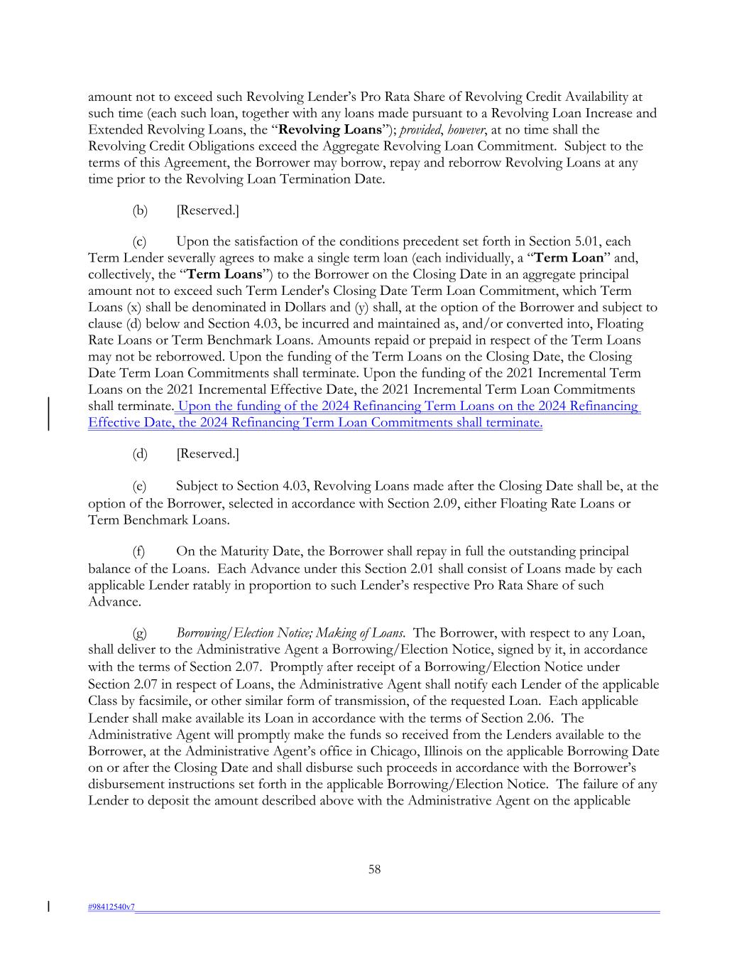 amount not to exceed such Revolving Lender’s Pro Rata Share of Revolving Credit Availability at such time (each such loan, together with any loans made pursuant to a Revolving Loan Increase and Extended Revolving Loans, the “Revolving Loans”); provided, however, at no time shall the Revolving Credit Obligations exceed the Aggregate Revolving Loan Commitment. Subject to the terms of this Agreement, the Borrower may borrow, repay and reborrow Revolving Loans at any time prior to the Revolving Loan Termination Date. (b) [Reserved.] (c) Upon the satisfaction of the conditions precedent set forth in Section 5.01, each Term Lender severally agrees to make a single term loan (each individually, a “Term Loan” and, collectively, the “Term Loans”) to the Borrower on the Closing Date in an aggregate principal amount not to exceed such Term Lender's Closing Date Term Loan Commitment, which Term Loans (x) shall be denominated in Dollars and (y) shall, at the option of the Borrower and subject to clause (d) below and Section 4.03, be incurred and maintained as, and/or converted into, Floating Rate Loans or Term Benchmark Loans. Amounts repaid or prepaid in respect of the Term Loans may not be reborrowed. Upon the funding of the Term Loans on the Closing Date, the Closing Date Term Loan Commitments shall terminate. Upon the funding of the 2021 Incremental Term Loans on the 2021 Incremental Effective Date, the 2021 Incremental Term Loan Commitments shall terminate. Upon the funding of the 2024 Refinancing Term Loans on the 2024 Refinancing Effective Date, the 2024 Refinancing Term Loan Commitments shall terminate. (d) [Reserved.] (e) Subject to Section 4.03, Revolving Loans made after the Closing Date shall be, at the option of the Borrower, selected in accordance with Section 2.09, either Floating Rate Loans or Term Benchmark Loans. (f) On the Maturity Date, the Borrower shall repay in full the outstanding principal balance of the Loans. Each Advance under this Section 2.01 shall consist of Loans made by each applicable Lender ratably in proportion to such Lender’s respective Pro Rata Share of such Advance. (g) Borrowing/Election Notice; Making of Loans. The Borrower, with respect to any Loan, shall deliver to the Administrative Agent a Borrowing/Election Notice, signed by it, in accordance with the terms of Section 2.07. Promptly after receipt of a Borrowing/Election Notice under Section 2.07 in respect of Loans, the Administrative Agent shall notify each Lender of the applicable Class by facsimile, or other similar form of transmission, of the requested Loan. Each applicable Lender shall make available its Loan in accordance with the terms of Section 2.06. The Administrative Agent will promptly make the funds so received from the Lenders available to the Borrower, at the Administrative Agent’s office in Chicago, Illinois on the applicable Borrowing Date on or after the Closing Date and shall disburse such proceeds in accordance with the Borrower’s disbursement instructions set forth in the applicable Borrowing/Election Notice. The failure of any Lender to deposit the amount described above with the Administrative Agent on the applicable 58 #98412540v7