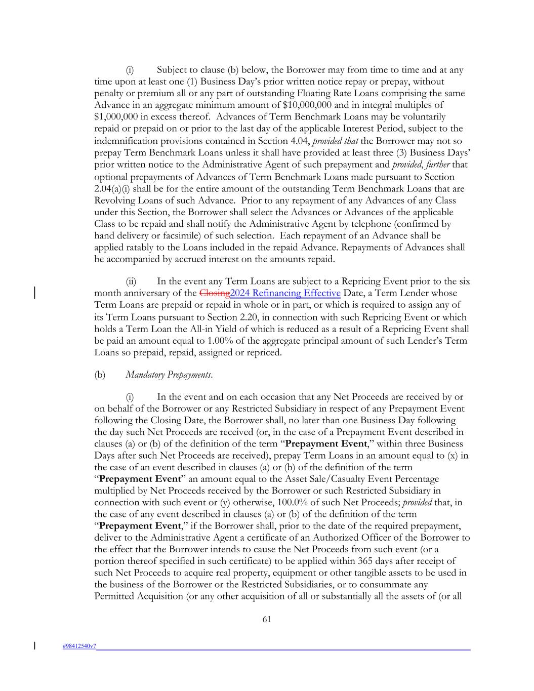 (i) Subject to clause (b) below, the Borrower may from time to time and at any time upon at least one (1) Business Day’s prior written notice repay or prepay, without penalty or premium all or any part of outstanding Floating Rate Loans comprising the same Advance in an aggregate minimum amount of $10,000,000 and in integral multiples of $1,000,000 in excess thereof. Advances of Term Benchmark Loans may be voluntarily repaid or prepaid on or prior to the last day of the applicable Interest Period, subject to the indemnification provisions contained in Section 4.04, provided that the Borrower may not so prepay Term Benchmark Loans unless it shall have provided at least three (3) Business Days’ prior written notice to the Administrative Agent of such prepayment and provided, further that optional prepayments of Advances of Term Benchmark Loans made pursuant to Section 2.04(a)(i) shall be for the entire amount of the outstanding Term Benchmark Loans that are Revolving Loans of such Advance. Prior to any repayment of any Advances of any Class under this Section, the Borrower shall select the Advances or Advances of the applicable Class to be repaid and shall notify the Administrative Agent by telephone (confirmed by hand delivery or facsimile) of such selection. Each repayment of an Advance shall be applied ratably to the Loans included in the repaid Advance. Repayments of Advances shall be accompanied by accrued interest on the amounts repaid. (ii) In the event any Term Loans are subject to a Repricing Event prior to the six month anniversary of the Closing2024 Refinancing Effective Date, a Term Lender whose Term Loans are prepaid or repaid in whole or in part, or which is required to assign any of its Term Loans pursuant to Section 2.20, in connection with such Repricing Event or which holds a Term Loan the All-in Yield of which is reduced as a result of a Repricing Event shall be paid an amount equal to 1.00% of the aggregate principal amount of such Lender’s Term Loans so prepaid, repaid, assigned or repriced. (b) Mandatory Prepayments. (i) In the event and on each occasion that any Net Proceeds are received by or on behalf of the Borrower or any Restricted Subsidiary in respect of any Prepayment Event following the Closing Date, the Borrower shall, no later than one Business Day following the day such Net Proceeds are received (or, in the case of a Prepayment Event described in clauses (a) or (b) of the definition of the term “Prepayment Event,” within three Business Days after such Net Proceeds are received), prepay Term Loans in an amount equal to (x) in the case of an event described in clauses (a) or (b) of the definition of the term “Prepayment Event” an amount equal to the Asset Sale/Casualty Event Percentage multiplied by Net Proceeds received by the Borrower or such Restricted Subsidiary in connection with such event or (y) otherwise, 100.0% of such Net Proceeds; provided that, in the case of any event described in clauses (a) or (b) of the definition of the term “Prepayment Event,” if the Borrower shall, prior to the date of the required prepayment, deliver to the Administrative Agent a certificate of an Authorized Officer of the Borrower to the effect that the Borrower intends to cause the Net Proceeds from such event (or a portion thereof specified in such certificate) to be applied within 365 days after receipt of such Net Proceeds to acquire real property, equipment or other tangible assets to be used in the business of the Borrower or the Restricted Subsidiaries, or to consummate any Permitted Acquisition (or any other acquisition of all or substantially all the assets of (or all 61 #98412540v7