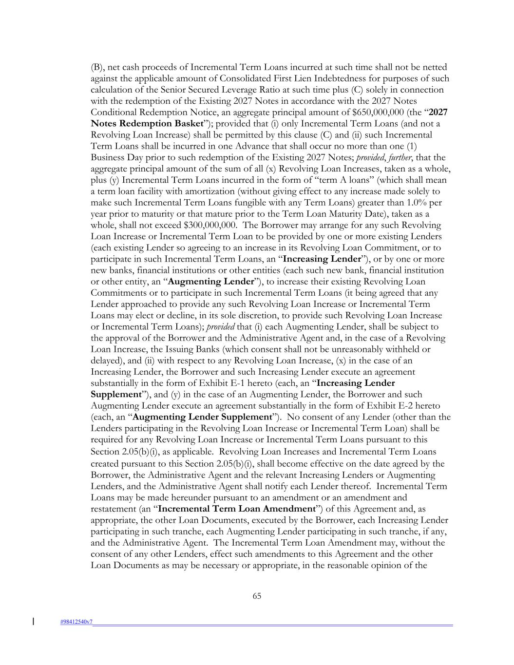 (B), net cash proceeds of Incremental Term Loans incurred at such time shall not be netted against the applicable amount of Consolidated First Lien Indebtedness for purposes of such calculation of the Senior Secured Leverage Ratio at such time plus (C) solely in connection with the redemption of the Existing 2027 Notes in accordance with the 2027 Notes Conditional Redemption Notice, an aggregate principal amount of $650,000,000 (the “2027 Notes Redemption Basket”); provided that (i) only Incremental Term Loans (and not a Revolving Loan Increase) shall be permitted by this clause (C) and (ii) such Incremental Term Loans shall be incurred in one Advance that shall occur no more than one (1) Business Day prior to such redemption of the Existing 2027 Notes; provided, further, that the aggregate principal amount of the sum of all (x) Revolving Loan Increases, taken as a whole, plus (y) Incremental Term Loans incurred in the form of “term A loans” (which shall mean a term loan facility with amortization (without giving effect to any increase made solely to make such Incremental Term Loans fungible with any Term Loans) greater than 1.0% per year prior to maturity or that mature prior to the Term Loan Maturity Date), taken as a whole, shall not exceed $300,000,000. The Borrower may arrange for any such Revolving Loan Increase or Incremental Term Loan to be provided by one or more existing Lenders (each existing Lender so agreeing to an increase in its Revolving Loan Commitment, or to participate in such Incremental Term Loans, an “Increasing Lender”), or by one or more new banks, financial institutions or other entities (each such new bank, financial institution or other entity, an “Augmenting Lender”), to increase their existing Revolving Loan Commitments or to participate in such Incremental Term Loans (it being agreed that any Lender approached to provide any such Revolving Loan Increase or Incremental Term Loans may elect or decline, in its sole discretion, to provide such Revolving Loan Increase or Incremental Term Loans); provided that (i) each Augmenting Lender, shall be subject to the approval of the Borrower and the Administrative Agent and, in the case of a Revolving Loan Increase, the Issuing Banks (which consent shall not be unreasonably withheld or delayed), and (ii) with respect to any Revolving Loan Increase, (x) in the case of an Increasing Lender, the Borrower and such Increasing Lender execute an agreement substantially in the form of Exhibit E-1 hereto (each, an “Increasing Lender Supplement”), and (y) in the case of an Augmenting Lender, the Borrower and such Augmenting Lender execute an agreement substantially in the form of Exhibit E-2 hereto (each, an “Augmenting Lender Supplement”). No consent of any Lender (other than the Lenders participating in the Revolving Loan Increase or Incremental Term Loan) shall be required for any Revolving Loan Increase or Incremental Term Loans pursuant to this Section 2.05(b)(i), as applicable. Revolving Loan Increases and Incremental Term Loans created pursuant to this Section 2.05(b)(i), shall become effective on the date agreed by the Borrower, the Administrative Agent and the relevant Increasing Lenders or Augmenting Lenders, and the Administrative Agent shall notify each Lender thereof. Incremental Term Loans may be made hereunder pursuant to an amendment or an amendment and restatement (an “Incremental Term Loan Amendment”) of this Agreement and, as appropriate, the other Loan Documents, executed by the Borrower, each Increasing Lender participating in such tranche, each Augmenting Lender participating in such tranche, if any, and the Administrative Agent. The Incremental Term Loan Amendment may, without the consent of any other Lenders, effect such amendments to this Agreement and the other Loan Documents as may be necessary or appropriate, in the reasonable opinion of the 65 #98412540v7