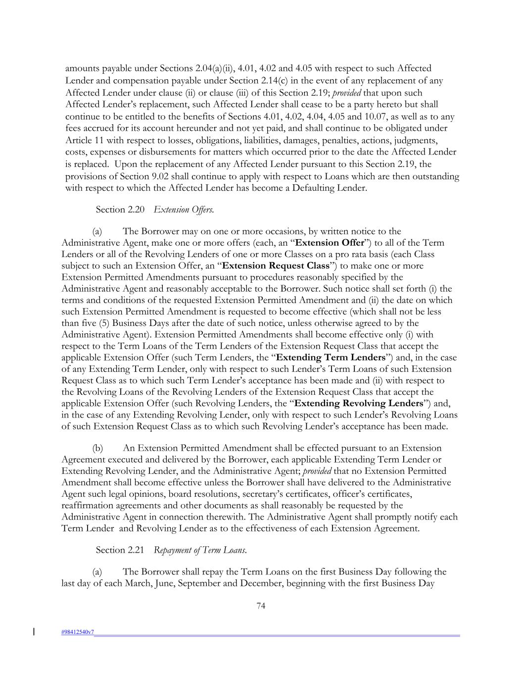 amounts payable under Sections 2.04(a)(ii), 4.01, 4.02 and 4.05 with respect to such Affected Lender and compensation payable under Section 2.14(c) in the event of any replacement of any Affected Lender under clause (ii) or clause (iii) of this Section 2.19; provided that upon such Affected Lender’s replacement, such Affected Lender shall cease to be a party hereto but shall continue to be entitled to the benefits of Sections 4.01, 4.02, 4.04, 4.05 and 10.07, as well as to any fees accrued for its account hereunder and not yet paid, and shall continue to be obligated under Article 11 with respect to losses, obligations, liabilities, damages, penalties, actions, judgments, costs, expenses or disbursements for matters which occurred prior to the date the Affected Lender is replaced. Upon the replacement of any Affected Lender pursuant to this Section 2.19, the provisions of Section 9.02 shall continue to apply with respect to Loans which are then outstanding with respect to which the Affected Lender has become a Defaulting Lender. Section 2.20 Extension Offers. (a) The Borrower may on one or more occasions, by written notice to the Administrative Agent, make one or more offers (each, an “Extension Offer”) to all of the Term Lenders or all of the Revolving Lenders of one or more Classes on a pro rata basis (each Class subject to such an Extension Offer, an “Extension Request Class”) to make one or more Extension Permitted Amendments pursuant to procedures reasonably specified by the Administrative Agent and reasonably acceptable to the Borrower. Such notice shall set forth (i) the terms and conditions of the requested Extension Permitted Amendment and (ii) the date on which such Extension Permitted Amendment is requested to become effective (which shall not be less than five (5) Business Days after the date of such notice, unless otherwise agreed to by the Administrative Agent). Extension Permitted Amendments shall become effective only (i) with respect to the Term Loans of the Term Lenders of the Extension Request Class that accept the applicable Extension Offer (such Term Lenders, the “Extending Term Lenders”) and, in the case of any Extending Term Lender, only with respect to such Lender’s Term Loans of such Extension Request Class as to which such Term Lender’s acceptance has been made and (ii) with respect to the Revolving Loans of the Revolving Lenders of the Extension Request Class that accept the applicable Extension Offer (such Revolving Lenders, the “Extending Revolving Lenders”) and, in the case of any Extending Revolving Lender, only with respect to such Lender’s Revolving Loans of such Extension Request Class as to which such Revolving Lender’s acceptance has been made. (b) An Extension Permitted Amendment shall be effected pursuant to an Extension Agreement executed and delivered by the Borrower, each applicable Extending Term Lender or Extending Revolving Lender, and the Administrative Agent; provided that no Extension Permitted Amendment shall become effective unless the Borrower shall have delivered to the Administrative Agent such legal opinions, board resolutions, secretary’s certificates, officer’s certificates, reaffirmation agreements and other documents as shall reasonably be requested by the Administrative Agent in connection therewith. The Administrative Agent shall promptly notify each Term Lender and Revolving Lender as to the effectiveness of each Extension Agreement. Section 2.21 Repayment of Term Loans. (a) The Borrower shall repay the Term Loans on the first Business Day following the last day of each March, June, September and December, beginning with the first Business Day 74 #98412540v7