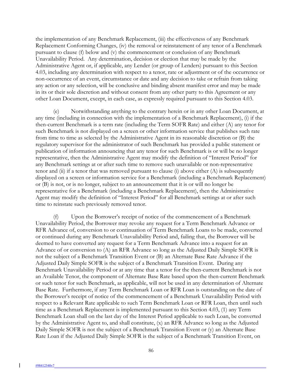 the implementation of any Benchmark Replacement, (iii) the effectiveness of any Benchmark Replacement Conforming Changes, (iv) the removal or reinstatement of any tenor of a Benchmark pursuant to clause (f) below and (v) the commencement or conclusion of any Benchmark Unavailability Period. Any determination, decision or election that may be made by the Administrative Agent or, if applicable, any Lender (or group of Lenders) pursuant to this Section 4.03, including any determination with respect to a tenor, rate or adjustment or of the occurrence or non-occurrence of an event, circumstance or date and any decision to take or refrain from taking any action or any selection, will be conclusive and binding absent manifest error and may be made in its or their sole discretion and without consent from any other party to this Agreement or any other Loan Document, except, in each case, as expressly required pursuant to this Section 4.03. (e) Notwithstanding anything to the contrary herein or in any other Loan Document, at any time (including in connection with the implementation of a Benchmark Replacement), (i) if the then-current Benchmark is a term rate (including the Term SOFR Rate) and either (A) any tenor for such Benchmark is not displayed on a screen or other information service that publishes such rate from time to time as selected by the Administrative Agent in its reasonable discretion or (B) the regulatory supervisor for the administrator of such Benchmark has provided a public statement or publication of information announcing that any tenor for such Benchmark is or will be no longer representative, then the Administrative Agent may modify the definition of “Interest Period” for any Benchmark settings at or after such time to remove such unavailable or non-representative tenor and (ii) if a tenor that was removed pursuant to clause (i) above either (A) is subsequently displayed on a screen or information service for a Benchmark (including a Benchmark Replacement) or (B) is not, or is no longer, subject to an announcement that it is or will no longer be representative for a Benchmark (including a Benchmark Replacement), then the Administrative Agent may modify the definition of “Interest Period” for all Benchmark settings at or after such time to reinstate such previously removed tenor. (f) Upon the Borrower’s receipt of notice of the commencement of a Benchmark Unavailability Period, the Borrower may revoke any request for a Term Benchmark Advance or RFR Advance of, conversion to or continuation of Term Benchmark Loans to be made, converted or continued during any Benchmark Unavailability Period and, failing that, the Borrower will be deemed to have converted any request for a Term Benchmark Advance into a request for an Advance of or conversion to (A) an RFR Advance so long as the Adjusted Daily Simple SOFR is not the subject of a Benchmark Transition Event or (B) an Alternate Base Rate Advance if the Adjusted Daily Simple SOFR is the subject of a Benchmark Transition Event. During any Benchmark Unavailability Period or at any time that a tenor for the then-current Benchmark is not an Available Tenor, the component of Alternate Base Rate based upon the then-current Benchmark or such tenor for such Benchmark, as applicable, will not be used in any determination of Alternate Base Rate. Furthermore, if any Term Benchmark Loan or RFR Loan is outstanding on the date of the Borrower’s receipt of notice of the commencement of a Benchmark Unavailability Period with respect to a Relevant Rate applicable to such Term Benchmark Loan or RFR Loan, then until such time as a Benchmark Replacement is implemented pursuant to this Section 4.03, (1) any Term Benchmark Loan shall on the last day of the Interest Period applicable to such Loan, be converted by the Administrative Agent to, and shall constitute, (x) an RFR Advance so long as the Adjusted Daily Simple SOFR is not the subject of a Benchmark Transition Event or (y) an Alternate Base Rate Loan if the Adjusted Daily Simple SOFR is the subject of a Benchmark Transition Event, on 86 #98412540v7