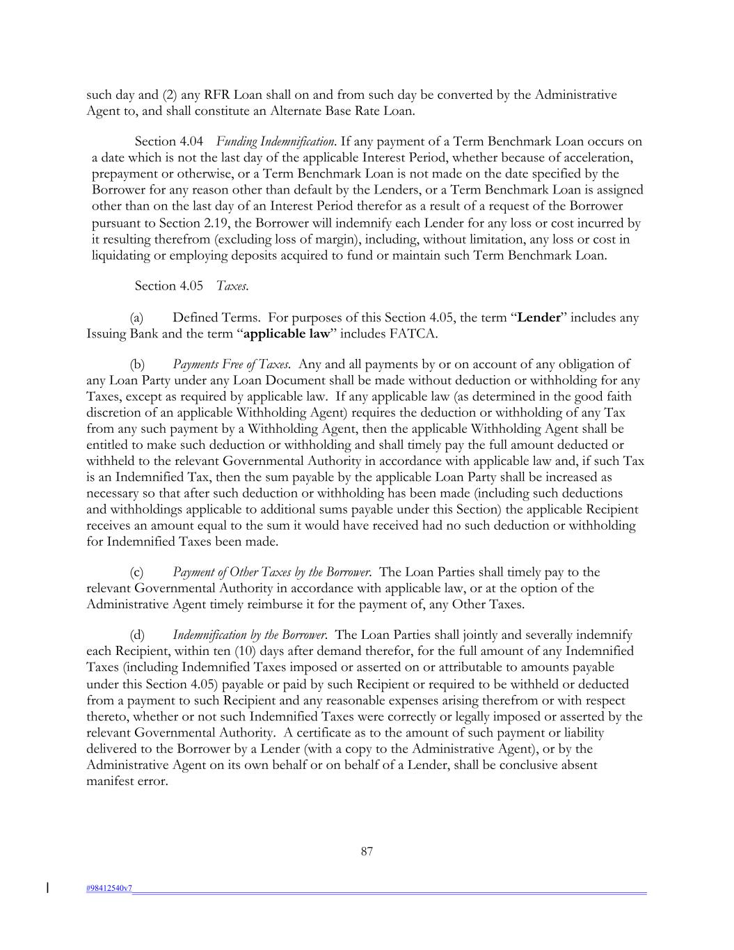 such day and (2) any RFR Loan shall on and from such day be converted by the Administrative Agent to, and shall constitute an Alternate Base Rate Loan. Section 4.04 Funding Indemnification. If any payment of a Term Benchmark Loan occurs on a date which is not the last day of the applicable Interest Period, whether because of acceleration, prepayment or otherwise, or a Term Benchmark Loan is not made on the date specified by the Borrower for any reason other than default by the Lenders, or a Term Benchmark Loan is assigned other than on the last day of an Interest Period therefor as a result of a request of the Borrower pursuant to Section 2.19, the Borrower will indemnify each Lender for any loss or cost incurred by it resulting therefrom (excluding loss of margin), including, without limitation, any loss or cost in liquidating or employing deposits acquired to fund or maintain such Term Benchmark Loan. Section 4.05 Taxes. (a) Defined Terms. For purposes of this Section 4.05, the term “Lender” includes any Issuing Bank and the term “applicable law” includes FATCA. (b) Payments Free of Taxes. Any and all payments by or on account of any obligation of any Loan Party under any Loan Document shall be made without deduction or withholding for any Taxes, except as required by applicable law. If any applicable law (as determined in the good faith discretion of an applicable Withholding Agent) requires the deduction or withholding of any Tax from any such payment by a Withholding Agent, then the applicable Withholding Agent shall be entitled to make such deduction or withholding and shall timely pay the full amount deducted or withheld to the relevant Governmental Authority in accordance with applicable law and, if such Tax is an Indemnified Tax, then the sum payable by the applicable Loan Party shall be increased as necessary so that after such deduction or withholding has been made (including such deductions and withholdings applicable to additional sums payable under this Section) the applicable Recipient receives an amount equal to the sum it would have received had no such deduction or withholding for Indemnified Taxes been made. (c) Payment of Other Taxes by the Borrower. The Loan Parties shall timely pay to the relevant Governmental Authority in accordance with applicable law, or at the option of the Administrative Agent timely reimburse it for the payment of, any Other Taxes. (d) Indemnification by the Borrower. The Loan Parties shall jointly and severally indemnify each Recipient, within ten (10) days after demand therefor, for the full amount of any Indemnified Taxes (including Indemnified Taxes imposed or asserted on or attributable to amounts payable under this Section 4.05) payable or paid by such Recipient or required to be withheld or deducted from a payment to such Recipient and any reasonable expenses arising therefrom or with respect thereto, whether or not such Indemnified Taxes were correctly or legally imposed or asserted by the relevant Governmental Authority. A certificate as to the amount of such payment or liability delivered to the Borrower by a Lender (with a copy to the Administrative Agent), or by the Administrative Agent on its own behalf or on behalf of a Lender, shall be conclusive absent manifest error. 87 #98412540v7