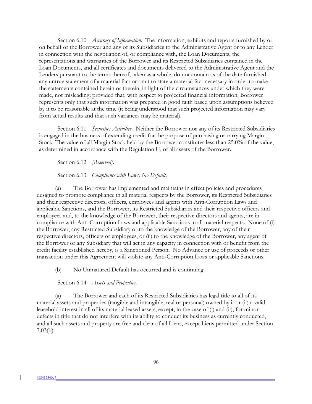 Section 6.10 Accuracy of Information. The information, exhibits and reports furnished by or on behalf of the Borrower and any of its Subsidiaries to the Administrative Agent or to any Lender in connection with the negotiation of, or compliance with, the Loan Documents, the representations and warranties of the Borrower and its Restricted Subsidiaries contained in the Loan Documents, and all certificates and documents delivered to the Administrative Agent and the Lenders pursuant to the terms thereof, taken as a whole, do not contain as of the date furnished any untrue statement of a material fact or omit to state a material fact necessary in order to make the statements contained herein or therein, in light of the circumstances under which they were made, not misleading; provided that, with respect to projected financial information, Borrower represents only that such information was prepared in good faith based upon assumptions believed by it to be reasonable at the time (it being understood that such projected information may vary from actual results and that such variances may be material). Section 6.11 Securities Activities. Neither the Borrower nor any of its Restricted Subsidiaries is engaged in the business of extending credit for the purpose of purchasing or carrying Margin Stock. The value of all Margin Stock held by the Borrower constitutes less than 25.0% of the value, as determined in accordance with the Regulation U, of all assets of the Borrower. Section 6.12 [Reserved]. Section 6.13 Compliance with Laws; No Default. (a) The Borrower has implemented and maintains in effect policies and procedures designed to promote compliance in all material respects by the Borrower, its Restricted Subsidiaries and their respective directors, officers, employees and agents with Anti-Corruption Laws and applicable Sanctions, and the Borrower, its Restricted Subsidiaries and their respective officers and employees and, to the knowledge of the Borrower, their respective directors and agents, are in compliance with Anti-Corruption Laws and applicable Sanctions in all material respects. None of (i) the Borrower, any Restricted Subsidiary or to the knowledge of the Borrower, any of their respective directors, officers or employees, or (ii) to the knowledge of the Borrower, any agent of the Borrower or any Subsidiary that will act in any capacity in connection with or benefit from the credit facility established hereby, is a Sanctioned Person. No Advance or use of proceeds or other transaction under this Agreement will violate any Anti-Corruption Laws or applicable Sanctions. (b) No Unmatured Default has occurred and is continuing. Section 6.14 Assets and Properties. (a) The Borrower and each of its Restricted Subsidiaries has legal title to all of its material assets and properties (tangible and intangible, real or personal) owned by it or (ii) a valid leasehold interest in all of its material leased assets, except, in the case of (i) and (ii), for minor defects in title that do not interfere with its ability to conduct its business as currently conducted, and all such assets and property are free and clear of all Liens, except Liens permitted under Section 7.03(b). 96 #98412540v7