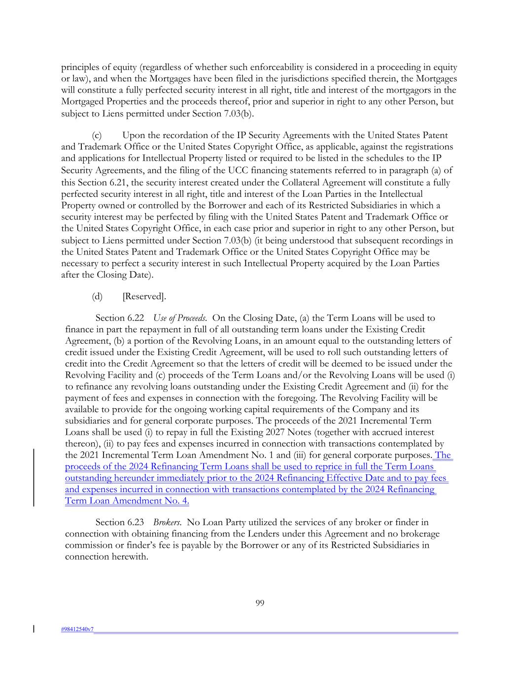 principles of equity (regardless of whether such enforceability is considered in a proceeding in equity or law), and when the Mortgages have been filed in the jurisdictions specified therein, the Mortgages will constitute a fully perfected security interest in all right, title and interest of the mortgagors in the Mortgaged Properties and the proceeds thereof, prior and superior in right to any other Person, but subject to Liens permitted under Section 7.03(b). (c) Upon the recordation of the IP Security Agreements with the United States Patent and Trademark Office or the United States Copyright Office, as applicable, against the registrations and applications for Intellectual Property listed or required to be listed in the schedules to the IP Security Agreements, and the filing of the UCC financing statements referred to in paragraph (a) of this Section 6.21, the security interest created under the Collateral Agreement will constitute a fully perfected security interest in all right, title and interest of the Loan Parties in the Intellectual Property owned or controlled by the Borrower and each of its Restricted Subsidiaries in which a security interest may be perfected by filing with the United States Patent and Trademark Office or the United States Copyright Office, in each case prior and superior in right to any other Person, but subject to Liens permitted under Section 7.03(b) (it being understood that subsequent recordings in the United States Patent and Trademark Office or the United States Copyright Office may be necessary to perfect a security interest in such Intellectual Property acquired by the Loan Parties after the Closing Date). (d) [Reserved]. Section 6.22 Use of Proceeds. On the Closing Date, (a) the Term Loans will be used to finance in part the repayment in full of all outstanding term loans under the Existing Credit Agreement, (b) a portion of the Revolving Loans, in an amount equal to the outstanding letters of credit issued under the Existing Credit Agreement, will be used to roll such outstanding letters of credit into the Credit Agreement so that the letters of credit will be deemed to be issued under the Revolving Facility and (c) proceeds of the Term Loans and/or the Revolving Loans will be used (i) to refinance any revolving loans outstanding under the Existing Credit Agreement and (ii) for the payment of fees and expenses in connection with the foregoing. The Revolving Facility will be available to provide for the ongoing working capital requirements of the Company and its subsidiaries and for general corporate purposes. The proceeds of the 2021 Incremental Term Loans shall be used (i) to repay in full the Existing 2027 Notes (together with accrued interest thereon), (ii) to pay fees and expenses incurred in connection with transactions contemplated by the 2021 Incremental Term Loan Amendment No. 1 and (iii) for general corporate purposes. The proceeds of the 2024 Refinancing Term Loans shall be used to reprice in full the Term Loans outstanding hereunder immediately prior to the 2024 Refinancing Effective Date and to pay fees and expenses incurred in connection with transactions contemplated by the 2024 Refinancing Term Loan Amendment No. 4. Section 6.23 Brokers. No Loan Party utilized the services of any broker or finder in connection with obtaining financing from the Lenders under this Agreement and no brokerage commission or finder’s fee is payable by the Borrower or any of its Restricted Subsidiaries in connection herewith. 99 #98412540v7