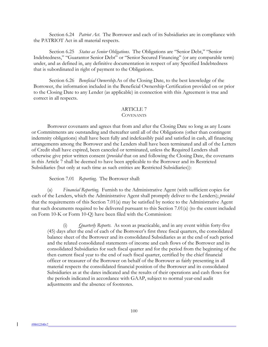 Section 6.24 Patriot Act. The Borrower and each of its Subsidiaries are in compliance with the PATRIOT Act in all material respects. Section 6.25 Status as Senior Obligations. The Obligations are “Senior Debt,” “Senior Indebtedness,” “Guarantor Senior Debt” or “Senior Secured Financing” (or any comparable term) under, and as defined in, any definitive documentation in respect of any Specified Indebtedness that is subordinated in right of payment to the Obligations. Section 6.26 Beneficial Ownership.As of the Closing Date, to the best knowledge of the Borrower, the information included in the Beneficial Ownership Certification provided on or prior to the Closing Date to any Lender (as applicable) in connection with this Agreement is true and correct in all respects. ARTICLE 7 COVENANTS Borrower covenants and agrees that from and after the Closing Date so long as any Loans or Commitments are outstanding and thereafter until all of the Obligations (other than contingent indemnity obligations) shall have been fully and indefeasibly paid and satisfied in cash, all financing arrangements among the Borrower and the Lenders shall have been terminated and all of the Letters of Credit shall have expired, been canceled or terminated, unless the Required Lenders shall otherwise give prior written consent (provided that on and following the Closing Date, the covenants in this Article 7 shall be deemed to have been applicable to the Borrower and its Restricted Subsidiaries (but only at such time as such entities are Restricted Subsidiaries)): Section 7.01 Reporting. The Borrower shall: (a) Financial Reporting. Furnish to the Administrative Agent (with sufficient copies for each of the Lenders, which the Administrative Agent shall promptly deliver to the Lenders); provided that the requirements of this Section 7.01(a) may be satisfied by notice to the Administrative Agent that such documents required to be delivered pursuant to this Section 7.01(a) (to the extent included on Form 10-K or Form 10-Q) have been filed with the Commission: (i) Quarterly Reports. As soon as practicable, and in any event within forty-five (45) days after the end of each of the Borrower’s first three fiscal quarters, the consolidated balance sheet of the Borrower and its consolidated Subsidiaries as at the end of such period and the related consolidated statements of income and cash flows of the Borrower and its consolidated Subsidiaries for such fiscal quarter and for the period from the beginning of the then current fiscal year to the end of such fiscal quarter, certified by the chief financial officer or treasurer of the Borrower on behalf of the Borrower as fairly presenting in all material respects the consolidated financial position of the Borrower and its consolidated Subsidiaries as at the dates indicated and the results of their operations and cash flows for the periods indicated in accordance with GAAP, subject to normal year-end audit adjustments and the absence of footnotes. 100 #98412540v7