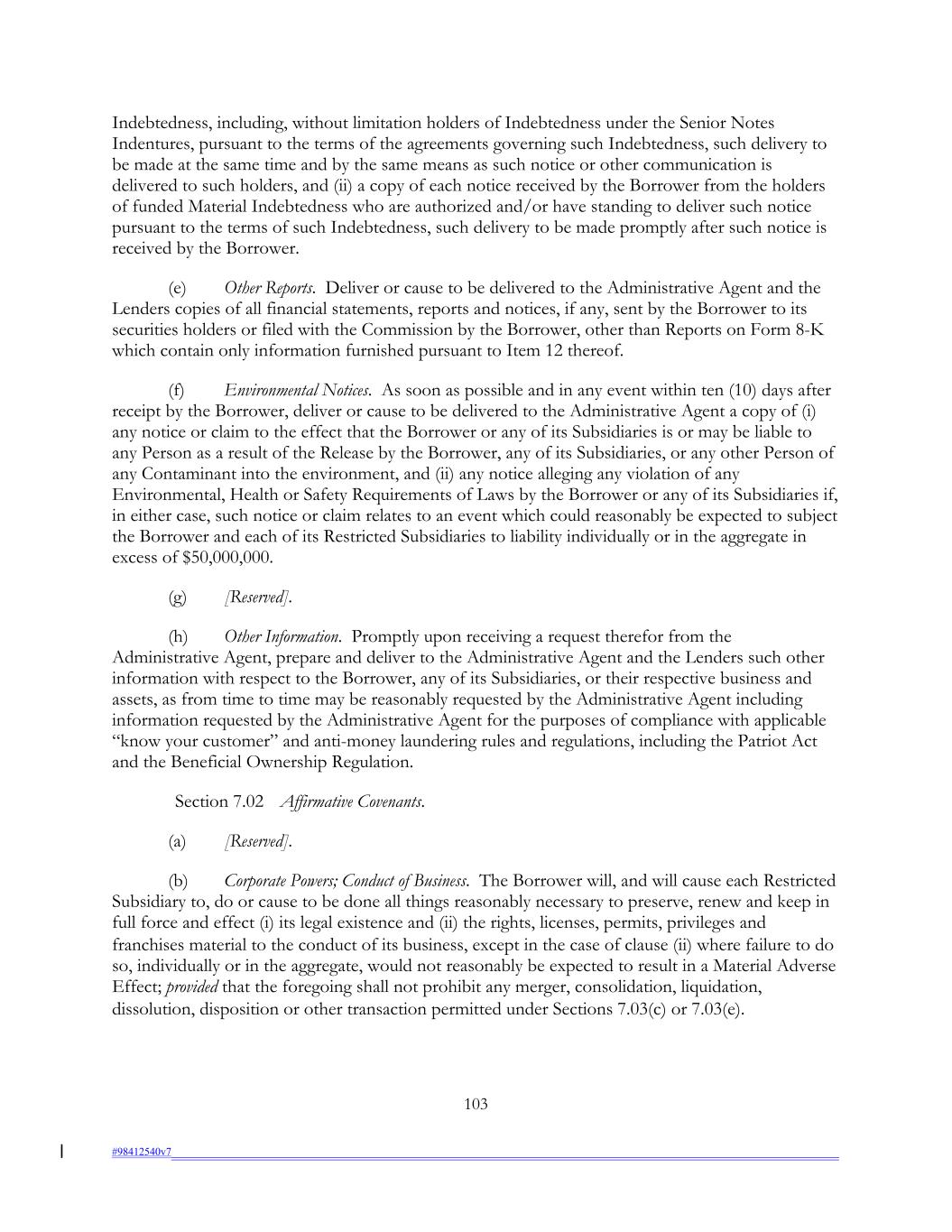 Indebtedness, including, without limitation holders of Indebtedness under the Senior Notes Indentures, pursuant to the terms of the agreements governing such Indebtedness, such delivery to be made at the same time and by the same means as such notice or other communication is delivered to such holders, and (ii) a copy of each notice received by the Borrower from the holders of funded Material Indebtedness who are authorized and/or have standing to deliver such notice pursuant to the terms of such Indebtedness, such delivery to be made promptly after such notice is received by the Borrower. (e) Other Reports. Deliver or cause to be delivered to the Administrative Agent and the Lenders copies of all financial statements, reports and notices, if any, sent by the Borrower to its securities holders or filed with the Commission by the Borrower, other than Reports on Form 8-K which contain only information furnished pursuant to Item 12 thereof. (f) Environmental Notices. As soon as possible and in any event within ten (10) days after receipt by the Borrower, deliver or cause to be delivered to the Administrative Agent a copy of (i) any notice or claim to the effect that the Borrower or any of its Subsidiaries is or may be liable to any Person as a result of the Release by the Borrower, any of its Subsidiaries, or any other Person of any Contaminant into the environment, and (ii) any notice alleging any violation of any Environmental, Health or Safety Requirements of Laws by the Borrower or any of its Subsidiaries if, in either case, such notice or claim relates to an event which could reasonably be expected to subject the Borrower and each of its Restricted Subsidiaries to liability individually or in the aggregate in excess of $50,000,000. (g) [Reserved]. (h) Other Information. Promptly upon receiving a request therefor from the Administrative Agent, prepare and deliver to the Administrative Agent and the Lenders such other information with respect to the Borrower, any of its Subsidiaries, or their respective business and assets, as from time to time may be reasonably requested by the Administrative Agent including information requested by the Administrative Agent for the purposes of compliance with applicable “know your customer” and anti-money laundering rules and regulations, including the Patriot Act and the Beneficial Ownership Regulation. Section 7.02 Affirmative Covenants. (a) [Reserved]. (b) Corporate Powers; Conduct of Business. The Borrower will, and will cause each Restricted Subsidiary to, do or cause to be done all things reasonably necessary to preserve, renew and keep in full force and effect (i) its legal existence and (ii) the rights, licenses, permits, privileges and franchises material to the conduct of its business, except in the case of clause (ii) where failure to do so, individually or in the aggregate, would not reasonably be expected to result in a Material Adverse Effect; provided that the foregoing shall not prohibit any merger, consolidation, liquidation, dissolution, disposition or other transaction permitted under Sections 7.03(c) or 7.03(e). 103 #98412540v7