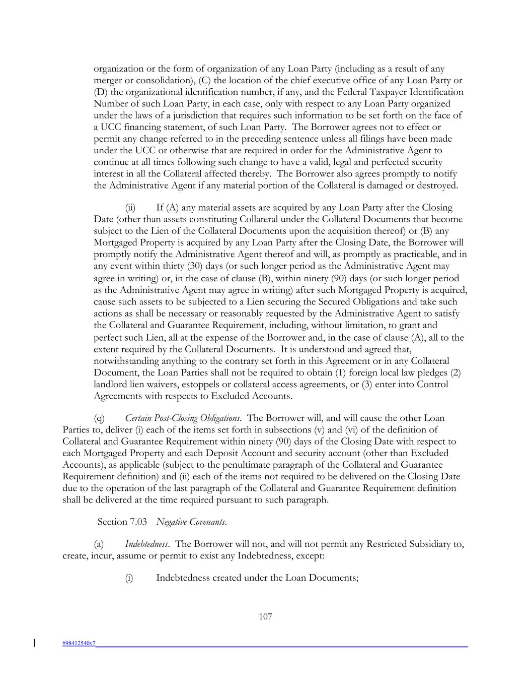 organization or the form of organization of any Loan Party (including as a result of any merger or consolidation), (C) the location of the chief executive office of any Loan Party or (D) the organizational identification number, if any, and the Federal Taxpayer Identification Number of such Loan Party, in each case, only with respect to any Loan Party organized under the laws of a jurisdiction that requires such information to be set forth on the face of a UCC financing statement, of such Loan Party. The Borrower agrees not to effect or permit any change referred to in the preceding sentence unless all filings have been made under the UCC or otherwise that are required in order for the Administrative Agent to continue at all times following such change to have a valid, legal and perfected security interest in all the Collateral affected thereby. The Borrower also agrees promptly to notify the Administrative Agent if any material portion of the Collateral is damaged or destroyed. (ii) If (A) any material assets are acquired by any Loan Party after the Closing Date (other than assets constituting Collateral under the Collateral Documents that become subject to the Lien of the Collateral Documents upon the acquisition thereof) or (B) any Mortgaged Property is acquired by any Loan Party after the Closing Date, the Borrower will promptly notify the Administrative Agent thereof and will, as promptly as practicable, and in any event within thirty (30) days (or such longer period as the Administrative Agent may agree in writing) or, in the case of clause (B), within ninety (90) days (or such longer period as the Administrative Agent may agree in writing) after such Mortgaged Property is acquired, cause such assets to be subjected to a Lien securing the Secured Obligations and take such actions as shall be necessary or reasonably requested by the Administrative Agent to satisfy the Collateral and Guarantee Requirement, including, without limitation, to grant and perfect such Lien, all at the expense of the Borrower and, in the case of clause (A), all to the extent required by the Collateral Documents. It is understood and agreed that, notwithstanding anything to the contrary set forth in this Agreement or in any Collateral Document, the Loan Parties shall not be required to obtain (1) foreign local law pledges (2) landlord lien waivers, estoppels or collateral access agreements, or (3) enter into Control Agreements with respects to Excluded Accounts. (q) Certain Post-Closing Obligations. The Borrower will, and will cause the other Loan Parties to, deliver (i) each of the items set forth in subsections (v) and (vi) of the definition of Collateral and Guarantee Requirement within ninety (90) days of the Closing Date with respect to each Mortgaged Property and each Deposit Account and security account (other than Excluded Accounts), as applicable (subject to the penultimate paragraph of the Collateral and Guarantee Requirement definition) and (ii) each of the items not required to be delivered on the Closing Date due to the operation of the last paragraph of the Collateral and Guarantee Requirement definition shall be delivered at the time required pursuant to such paragraph. Section 7.03 Negative Covenants. (a) Indebtedness. The Borrower will not, and will not permit any Restricted Subsidiary to, create, incur, assume or permit to exist any Indebtedness, except: (i) Indebtedness created under the Loan Documents; 107 #98412540v7
