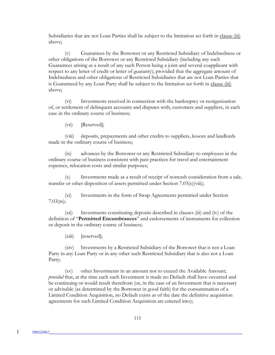 Subsidiaries that are not Loan Parties shall be subject to the limitation set forth in clause (iii) above; (v) Guarantees by the Borrower or any Restricted Subsidiary of Indebtedness or other obligations of the Borrower or any Restricted Subsidiary (including any such Guarantees arising as a result of any such Person being a joint and several coapplicant with respect to any letter of credit or letter of guaranty); provided that the aggregate amount of Indebtedness and other obligations of Restricted Subsidiaries that are not Loan Parties that is Guaranteed by any Loan Party shall be subject to the limitation set forth in clause (iii) above; (vi) Investments received in connection with the bankruptcy or reorganization of, or settlement of delinquent accounts and disputes with, customers and suppliers, in each case in the ordinary course of business; (vii) [Reserved]; (viii) deposits, prepayments and other credits to suppliers, lessors and landlords made in the ordinary course of business; (ix) advances by the Borrower or any Restricted Subsidiary to employees in the ordinary course of business consistent with past practices for travel and entertainment expenses, relocation costs and similar purposes; (x) Investments made as a result of receipt of noncash consideration from a sale, transfer or other disposition of assets permitted under Section 7.03(e)(viii); (xi) Investments in the form of Swap Agreements permitted under Section 7.03(m); (xii) Investments constituting deposits described in clauses (iii) and (iv) of the definition of “Permitted Encumbrances” and endorsements of instruments for collection or deposit in the ordinary course of business; (xiii) [reserved]; (xiv) Investments by a Restricted Subsidiary of the Borrower that is not a Loan Party in any Loan Party or in any other such Restricted Subsidiary that is also not a Loan Party; (xv) other Investments in an amount not to exceed the Available Amount; provided that, at the time each such Investment is made no Default shall have occurred and be continuing or would result therefrom (or, in the case of an Investment that is necessary or advisable (as determined by the Borrower in good faith) for the consummation of a Limited Condition Acquisition, no Default exists as of the date the definitive acquisition agreements for such Limited Condition Acquisition are entered into); 115 #98412540v7