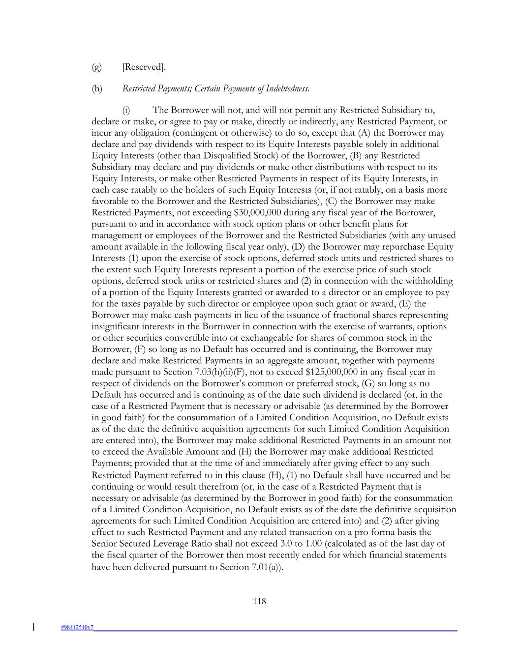 (g) [Reserved]. (h) Restricted Payments; Certain Payments of Indebtedness. (i) The Borrower will not, and will not permit any Restricted Subsidiary to, declare or make, or agree to pay or make, directly or indirectly, any Restricted Payment, or incur any obligation (contingent or otherwise) to do so, except that (A) the Borrower may declare and pay dividends with respect to its Equity Interests payable solely in additional Equity Interests (other than Disqualified Stock) of the Borrower, (B) any Restricted Subsidiary may declare and pay dividends or make other distributions with respect to its Equity Interests, or make other Restricted Payments in respect of its Equity Interests, in each case ratably to the holders of such Equity Interests (or, if not ratably, on a basis more favorable to the Borrower and the Restricted Subsidiaries), (C) the Borrower may make Restricted Payments, not exceeding $30,000,000 during any fiscal year of the Borrower, pursuant to and in accordance with stock option plans or other benefit plans for management or employees of the Borrower and the Restricted Subsidiaries (with any unused amount available in the following fiscal year only), (D) the Borrower may repurchase Equity Interests (1) upon the exercise of stock options, deferred stock units and restricted shares to the extent such Equity Interests represent a portion of the exercise price of such stock options, deferred stock units or restricted shares and (2) in connection with the withholding of a portion of the Equity Interests granted or awarded to a director or an employee to pay for the taxes payable by such director or employee upon such grant or award, (E) the Borrower may make cash payments in lieu of the issuance of fractional shares representing insignificant interests in the Borrower in connection with the exercise of warrants, options or other securities convertible into or exchangeable for shares of common stock in the Borrower, (F) so long as no Default has occurred and is continuing, the Borrower may declare and make Restricted Payments in an aggregate amount, together with payments made pursuant to Section 7.03(h)(ii)(F), not to exceed $125,000,000 in any fiscal year in respect of dividends on the Borrower’s common or preferred stock, (G) so long as no Default has occurred and is continuing as of the date such dividend is declared (or, in the case of a Restricted Payment that is necessary or advisable (as determined by the Borrower in good faith) for the consummation of a Limited Condition Acquisition, no Default exists as of the date the definitive acquisition agreements for such Limited Condition Acquisition are entered into), the Borrower may make additional Restricted Payments in an amount not to exceed the Available Amount and (H) the Borrower may make additional Restricted Payments; provided that at the time of and immediately after giving effect to any such Restricted Payment referred to in this clause (H), (1) no Default shall have occurred and be continuing or would result therefrom (or, in the case of a Restricted Payment that is necessary or advisable (as determined by the Borrower in good faith) for the consummation of a Limited Condition Acquisition, no Default exists as of the date the definitive acquisition agreements for such Limited Condition Acquisition are entered into) and (2) after giving effect to such Restricted Payment and any related transaction on a pro forma basis the Senior Secured Leverage Ratio shall not exceed 3.0 to 1.00 (calculated as of the last day of the fiscal quarter of the Borrower then most recently ended for which financial statements have been delivered pursuant to Section 7.01(a)). 118 #98412540v7