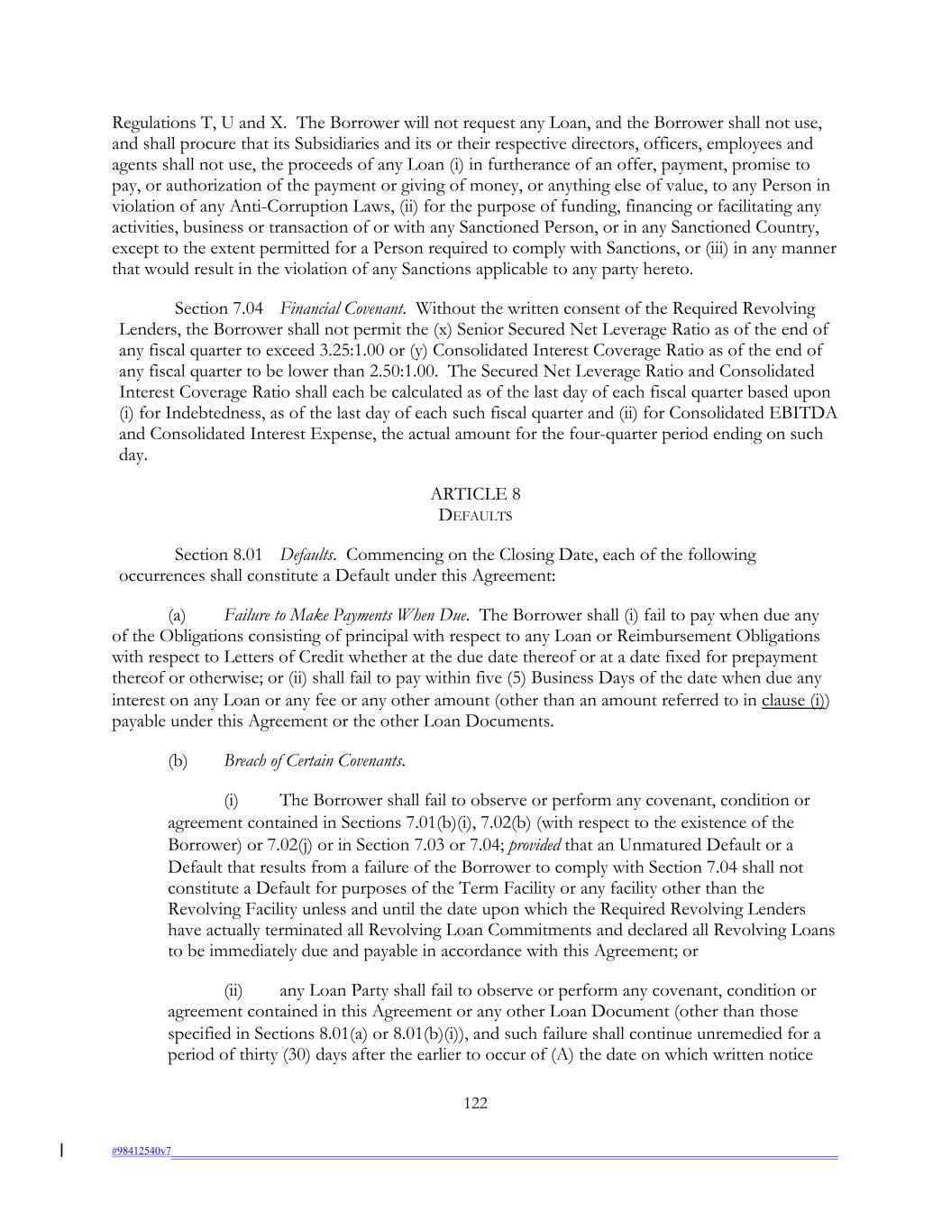 Regulations T, U and X. The Borrower will not request any Loan, and the Borrower shall not use, and shall procure that its Subsidiaries and its or their respective directors, officers, employees and agents shall not use, the proceeds of any Loan (i) in furtherance of an offer, payment, promise to pay, or authorization of the payment or giving of money, or anything else of value, to any Person in violation of any Anti-Corruption Laws, (ii) for the purpose of funding, financing or facilitating any activities, business or transaction of or with any Sanctioned Person, or in any Sanctioned Country, except to the extent permitted for a Person required to comply with Sanctions, or (iii) in any manner that would result in the violation of any Sanctions applicable to any party hereto. Section 7.04 Financial Covenant. Without the written consent of the Required Revolving Lenders, the Borrower shall not permit the (x) Senior Secured Net Leverage Ratio as of the end of any fiscal quarter to exceed 3.25:1.00 or (y) Consolidated Interest Coverage Ratio as of the end of any fiscal quarter to be lower than 2.50:1.00. The Secured Net Leverage Ratio and Consolidated Interest Coverage Ratio shall each be calculated as of the last day of each fiscal quarter based upon (i) for Indebtedness, as of the last day of each such fiscal quarter and (ii) for Consolidated EBITDA and Consolidated Interest Expense, the actual amount for the four-quarter period ending on such day. ARTICLE 8 DEFAULTS Section 8.01 Defaults. Commencing on the Closing Date, each of the following occurrences shall constitute a Default under this Agreement: (a) Failure to Make Payments When Due. The Borrower shall (i) fail to pay when due any of the Obligations consisting of principal with respect to any Loan or Reimbursement Obligations with respect to Letters of Credit whether at the due date thereof or at a date fixed for prepayment thereof or otherwise; or (ii) shall fail to pay within five (5) Business Days of the date when due any interest on any Loan or any fee or any other amount (other than an amount referred to in clause (i)) payable under this Agreement or the other Loan Documents. (b) Breach of Certain Covenants. (i) The Borrower shall fail to observe or perform any covenant, condition or agreement contained in Sections 7.01(b)(i), 7.02(b) (with respect to the existence of the Borrower) or 7.02(j) or in Section 7.03 or 7.04; provided that an Unmatured Default or a Default that results from a failure of the Borrower to comply with Section 7.04 shall not constitute a Default for purposes of the Term Facility or any facility other than the Revolving Facility unless and until the date upon which the Required Revolving Lenders have actually terminated all Revolving Loan Commitments and declared all Revolving Loans to be immediately due and payable in accordance with this Agreement; or (ii) any Loan Party shall fail to observe or perform any covenant, condition or agreement contained in this Agreement or any other Loan Document (other than those specified in Sections 8.01(a) or 8.01(b)(i)), and such failure shall continue unremedied for a period of thirty (30) days after the earlier to occur of (A) the date on which written notice 122 #98412540v7