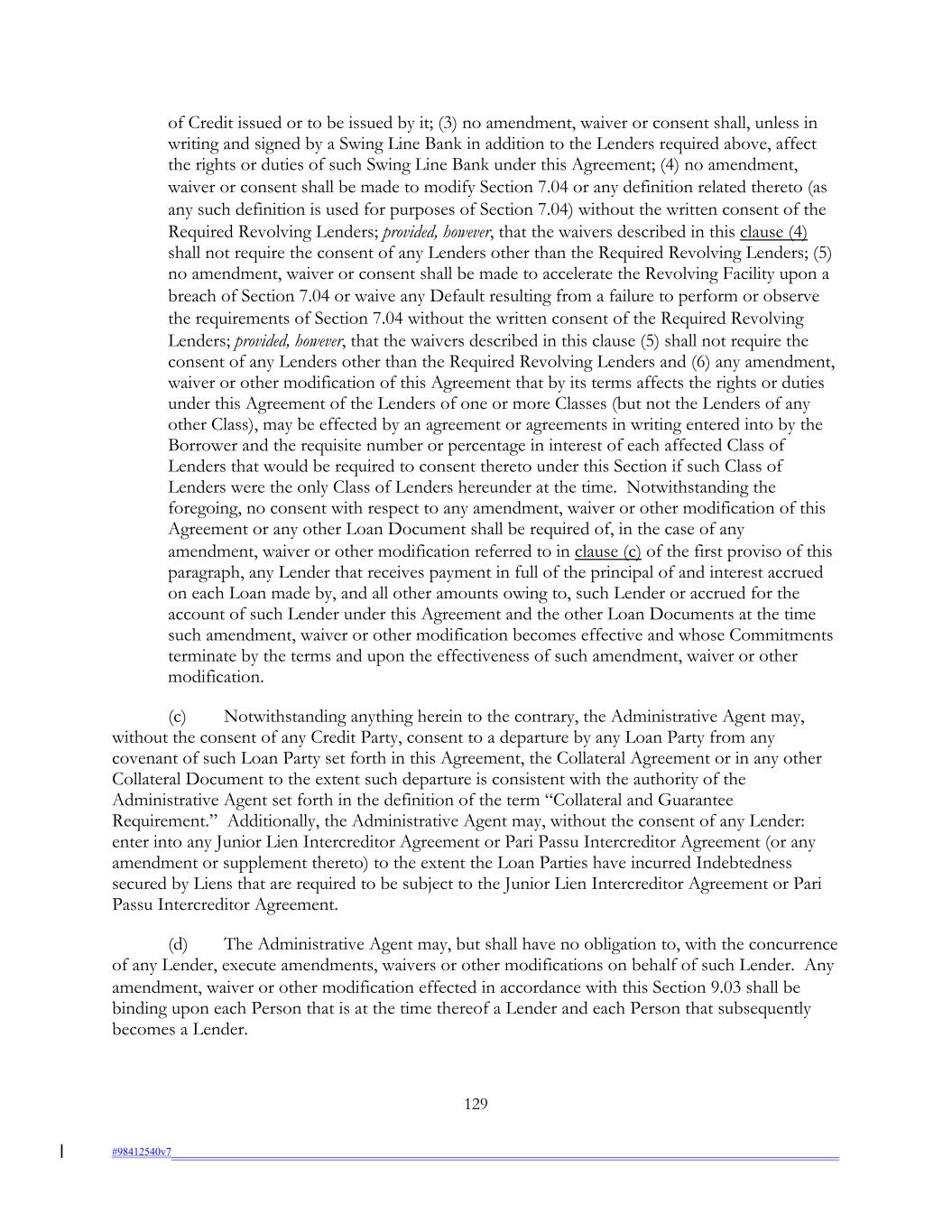 of Credit issued or to be issued by it; (3) no amendment, waiver or consent shall, unless in writing and signed by a Swing Line Bank in addition to the Lenders required above, affect the rights or duties of such Swing Line Bank under this Agreement; (4) no amendment, waiver or consent shall be made to modify Section 7.04 or any definition related thereto (as any such definition is used for purposes of Section 7.04) without the written consent of the Required Revolving Lenders; provided, however, that the waivers described in this clause (4) shall not require the consent of any Lenders other than the Required Revolving Lenders; (5) no amendment, waiver or consent shall be made to accelerate the Revolving Facility upon a breach of Section 7.04 or waive any Default resulting from a failure to perform or observe the requirements of Section 7.04 without the written consent of the Required Revolving Lenders; provided, however, that the waivers described in this clause (5) shall not require the consent of any Lenders other than the Required Revolving Lenders and (6) any amendment, waiver or other modification of this Agreement that by its terms affects the rights or duties under this Agreement of the Lenders of one or more Classes (but not the Lenders of any other Class), may be effected by an agreement or agreements in writing entered into by the Borrower and the requisite number or percentage in interest of each affected Class of Lenders that would be required to consent thereto under this Section if such Class of Lenders were the only Class of Lenders hereunder at the time. Notwithstanding the foregoing, no consent with respect to any amendment, waiver or other modification of this Agreement or any other Loan Document shall be required of, in the case of any amendment, waiver or other modification referred to in clause (c) of the first proviso of this paragraph, any Lender that receives payment in full of the principal of and interest accrued on each Loan made by, and all other amounts owing to, such Lender or accrued for the account of such Lender under this Agreement and the other Loan Documents at the time such amendment, waiver or other modification becomes effective and whose Commitments terminate by the terms and upon the effectiveness of such amendment, waiver or other modification. (c) Notwithstanding anything herein to the contrary, the Administrative Agent may, without the consent of any Credit Party, consent to a departure by any Loan Party from any covenant of such Loan Party set forth in this Agreement, the Collateral Agreement or in any other Collateral Document to the extent such departure is consistent with the authority of the Administrative Agent set forth in the definition of the term “Collateral and Guarantee Requirement.” Additionally, the Administrative Agent may, without the consent of any Lender: enter into any Junior Lien Intercreditor Agreement or Pari Passu Intercreditor Agreement (or any amendment or supplement thereto) to the extent the Loan Parties have incurred Indebtedness secured by Liens that are required to be subject to the Junior Lien Intercreditor Agreement or Pari Passu Intercreditor Agreement. (d) The Administrative Agent may, but shall have no obligation to, with the concurrence of any Lender, execute amendments, waivers or other modifications on behalf of such Lender. Any amendment, waiver or other modification effected in accordance with this Section 9.03 shall be binding upon each Person that is at the time thereof a Lender and each Person that subsequently becomes a Lender. 129 #98412540v7