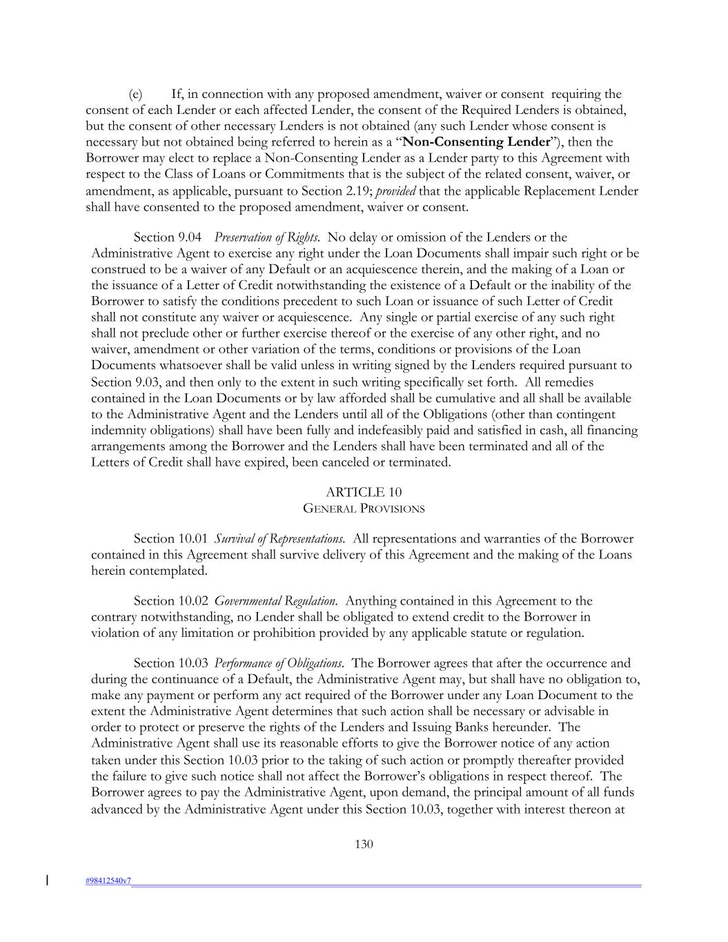 (e) If, in connection with any proposed amendment, waiver or consent requiring the consent of each Lender or each affected Lender, the consent of the Required Lenders is obtained, but the consent of other necessary Lenders is not obtained (any such Lender whose consent is necessary but not obtained being referred to herein as a “Non-Consenting Lender”), then the Borrower may elect to replace a Non-Consenting Lender as a Lender party to this Agreement with respect to the Class of Loans or Commitments that is the subject of the related consent, waiver, or amendment, as applicable, pursuant to Section 2.19; provided that the applicable Replacement Lender shall have consented to the proposed amendment, waiver or consent. Section 9.04 Preservation of Rights. No delay or omission of the Lenders or the Administrative Agent to exercise any right under the Loan Documents shall impair such right or be construed to be a waiver of any Default or an acquiescence therein, and the making of a Loan or the issuance of a Letter of Credit notwithstanding the existence of a Default or the inability of the Borrower to satisfy the conditions precedent to such Loan or issuance of such Letter of Credit shall not constitute any waiver or acquiescence. Any single or partial exercise of any such right shall not preclude other or further exercise thereof or the exercise of any other right, and no waiver, amendment or other variation of the terms, conditions or provisions of the Loan Documents whatsoever shall be valid unless in writing signed by the Lenders required pursuant to Section 9.03, and then only to the extent in such writing specifically set forth. All remedies contained in the Loan Documents or by law afforded shall be cumulative and all shall be available to the Administrative Agent and the Lenders until all of the Obligations (other than contingent indemnity obligations) shall have been fully and indefeasibly paid and satisfied in cash, all financing arrangements among the Borrower and the Lenders shall have been terminated and all of the Letters of Credit shall have expired, been canceled or terminated. ARTICLE 10 GENERAL PROVISIONS Section 10.01 Survival of Representations. All representations and warranties of the Borrower contained in this Agreement shall survive delivery of this Agreement and the making of the Loans herein contemplated. Section 10.02 Governmental Regulation. Anything contained in this Agreement to the contrary notwithstanding, no Lender shall be obligated to extend credit to the Borrower in violation of any limitation or prohibition provided by any applicable statute or regulation. Section 10.03 Performance of Obligations. The Borrower agrees that after the occurrence and during the continuance of a Default, the Administrative Agent may, but shall have no obligation to, make any payment or perform any act required of the Borrower under any Loan Document to the extent the Administrative Agent determines that such action shall be necessary or advisable in order to protect or preserve the rights of the Lenders and Issuing Banks hereunder. The Administrative Agent shall use its reasonable efforts to give the Borrower notice of any action taken under this Section 10.03 prior to the taking of such action or promptly thereafter provided the failure to give such notice shall not affect the Borrower’s obligations in respect thereof. The Borrower agrees to pay the Administrative Agent, upon demand, the principal amount of all funds advanced by the Administrative Agent under this Section 10.03, together with interest thereon at 130 #98412540v7