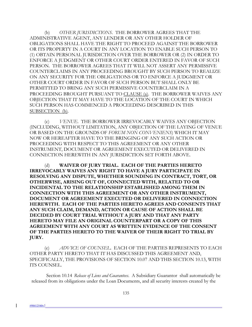 (b) OTHER JURISDICTIONS. THE BORROWER AGREES THAT THE ADMINISTRATIVE AGENT, ANY LENDER OR ANY OTHER HOLDER OF OBLIGATIONS SHALL HAVE THE RIGHT TO PROCEED AGAINST THE BORROWER OR ITS PROPERTY IN A COURT IN ANY LOCATION TO ENABLE SUCH PERSON TO (1) OBTAIN PERSONAL JURISDICTION OVER THE BORROWER OR (2) IN ORDER TO ENFORCE A JUDGMENT OR OTHER COURT ORDER ENTERED IN FAVOR OF SUCH PERSON. THE BORROWER AGREES THAT IT WILL NOT ASSERT ANY PERMISSIVE COUNTERCLAIMS IN ANY PROCEEDING BROUGHT BY SUCH PERSON TO REALIZE ON ANY SECURITY FOR THE OBLIGATIONS OR TO ENFORCE A JUDGMENT OR OTHER COURT ORDER IN FAVOR OF SUCH PERSON BUT SHALL ONLY BE PERMITTED TO BRING ANY SUCH PERMISSIVE COUNTERCLAIM IN A PROCEEDING BROUGHT PURSUANT TO CLAUSE (a). THE BORROWER WAIVES ANY OBJECTION THAT IT MAY HAVE TO THE LOCATION OF THE COURT IN WHICH SUCH PERSON HAS COMMENCED A PROCEEDING DESCRIBED IN THIS SUBSECTION (b). (c) VENUE. THE BORROWER IRREVOCABLY WAIVES ANY OBJECTION (INCLUDING, WITHOUT LIMITATION, ANY OBJECTION OF THE LAYING OF VENUE OR BASED ON THE GROUNDS OF FORUM NON CONVENIENS) WHICH IT MAY NOW OR HEREAFTER HAVE TO THE BRINGING OF ANY SUCH ACTION OR PROCEEDING WITH RESPECT TO THIS AGREEMENT OR ANY OTHER INSTRUMENT, DOCUMENT OR AGREEMENT EXECUTED OR DELIVERED IN CONNECTION HEREWITH IN ANY JURISDICTION SET FORTH ABOVE. (d) WAIVER OF JURY TRIAL. EACH OF THE PARTIES HERETO IRREVOCABLY WAIVES ANY RIGHT TO HAVE A JURY PARTICIPATE IN RESOLVING ANY DISPUTE, WHETHER SOUNDING IN CONTRACT, TORT, OR OTHERWISE, ARISING OUT OF, CONNECTED WITH, RELATED TO OR INCIDENTAL TO THE RELATIONSHIP ESTABLISHED AMONG THEM IN CONNECTION WITH THIS AGREEMENT OR ANY OTHER INSTRUMENT, DOCUMENT OR AGREEMENT EXECUTED OR DELIVERED IN CONNECTION HEREWITH. EACH OF THE PARTIES HERETO AGREES AND CONSENTS THAT ANY SUCH CLAIM, DEMAND, ACTION OR CAUSE OF ACTION SHALL BE DECIDED BY COURT TRIAL WITHOUT A JURY AND THAT ANY PARTY HERETO MAY FILE AN ORIGINAL COUNTERPART OR A COPY OF THIS AGREEMENT WITH ANY COURT AS WRITTEN EVIDENCE OF THE CONSENT OF THE PARTIES HERETO TO THE WAIVER OF THEIR RIGHT TO TRIAL BY JURY. (e) ADVICE OF COUNSEL. EACH OF THE PARTIES REPRESENTS TO EACH OTHER PARTY HERETO THAT IT HAS DISCUSSED THIS AGREEMENT AND, SPECIFICALLY, THE PROVISIONS OF SECTION 10.07 AND THIS SECTION 10.13, WITH ITS COUNSEL. Section 10.14 Release of Liens and Guarantees. A Subsidiary Guarantor shall automatically be released from its obligations under the Loan Documents, and all security interests created by the 135 #98412540v7