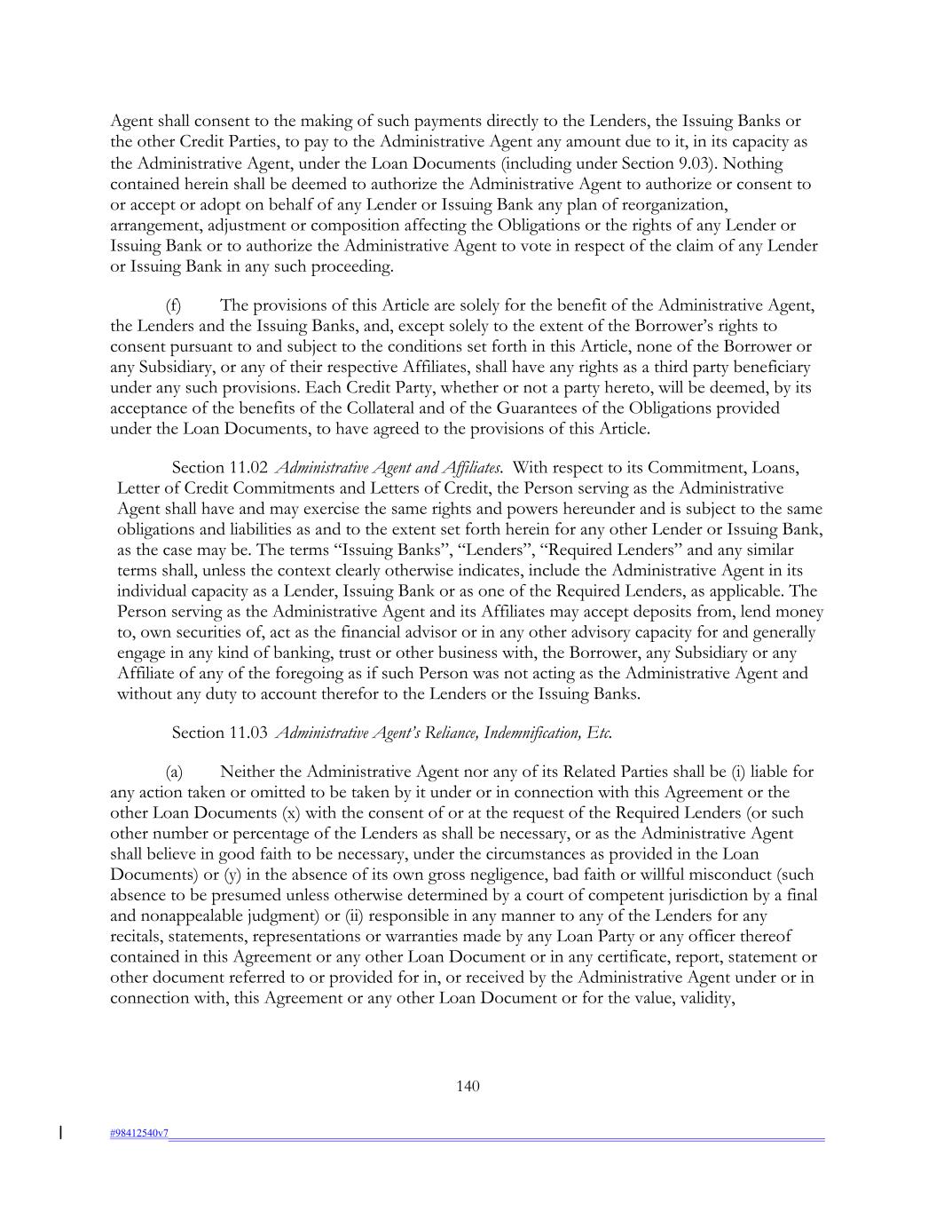 Agent shall consent to the making of such payments directly to the Lenders, the Issuing Banks or the other Credit Parties, to pay to the Administrative Agent any amount due to it, in its capacity as the Administrative Agent, under the Loan Documents (including under Section 9.03). Nothing contained herein shall be deemed to authorize the Administrative Agent to authorize or consent to or accept or adopt on behalf of any Lender or Issuing Bank any plan of reorganization, arrangement, adjustment or composition affecting the Obligations or the rights of any Lender or Issuing Bank or to authorize the Administrative Agent to vote in respect of the claim of any Lender or Issuing Bank in any such proceeding. (f) The provisions of this Article are solely for the benefit of the Administrative Agent, the Lenders and the Issuing Banks, and, except solely to the extent of the Borrower’s rights to consent pursuant to and subject to the conditions set forth in this Article, none of the Borrower or any Subsidiary, or any of their respective Affiliates, shall have any rights as a third party beneficiary under any such provisions. Each Credit Party, whether or not a party hereto, will be deemed, by its acceptance of the benefits of the Collateral and of the Guarantees of the Obligations provided under the Loan Documents, to have agreed to the provisions of this Article. Section 11.02 Administrative Agent and Affiliates. With respect to its Commitment, Loans, Letter of Credit Commitments and Letters of Credit, the Person serving as the Administrative Agent shall have and may exercise the same rights and powers hereunder and is subject to the same obligations and liabilities as and to the extent set forth herein for any other Lender or Issuing Bank, as the case may be. The terms “Issuing Banks”, “Lenders”, “Required Lenders” and any similar terms shall, unless the context clearly otherwise indicates, include the Administrative Agent in its individual capacity as a Lender, Issuing Bank or as one of the Required Lenders, as applicable. The Person serving as the Administrative Agent and its Affiliates may accept deposits from, lend money to, own securities of, act as the financial advisor or in any other advisory capacity for and generally engage in any kind of banking, trust or other business with, the Borrower, any Subsidiary or any Affiliate of any of the foregoing as if such Person was not acting as the Administrative Agent and without any duty to account therefor to the Lenders or the Issuing Banks. Section 11.03 Administrative Agent’s Reliance, Indemnification, Etc. (a) Neither the Administrative Agent nor any of its Related Parties shall be (i) liable for any action taken or omitted to be taken by it under or in connection with this Agreement or the other Loan Documents (x) with the consent of or at the request of the Required Lenders (or such other number or percentage of the Lenders as shall be necessary, or as the Administrative Agent shall believe in good faith to be necessary, under the circumstances as provided in the Loan Documents) or (y) in the absence of its own gross negligence, bad faith or willful misconduct (such absence to be presumed unless otherwise determined by a court of competent jurisdiction by a final and nonappealable judgment) or (ii) responsible in any manner to any of the Lenders for any recitals, statements, representations or warranties made by any Loan Party or any officer thereof contained in this Agreement or any other Loan Document or in any certificate, report, statement or other document referred to or provided for in, or received by the Administrative Agent under or in connection with, this Agreement or any other Loan Document or for the value, validity, 140 #98412540v7