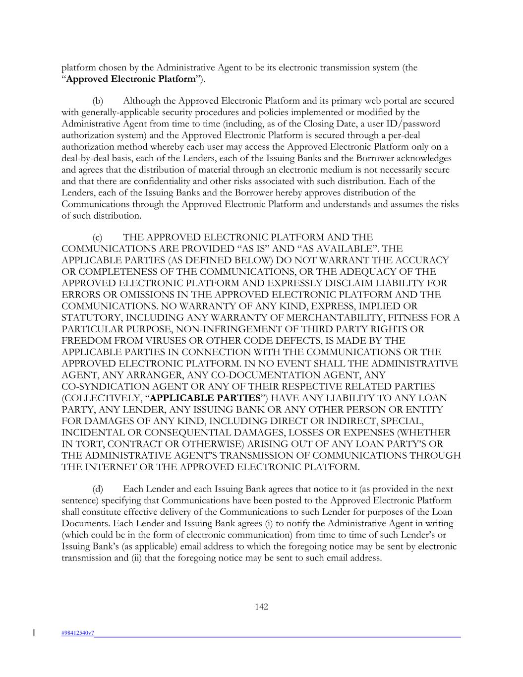 platform chosen by the Administrative Agent to be its electronic transmission system (the “Approved Electronic Platform”). (b) Although the Approved Electronic Platform and its primary web portal are secured with generally-applicable security procedures and policies implemented or modified by the Administrative Agent from time to time (including, as of the Closing Date, a user ID/password authorization system) and the Approved Electronic Platform is secured through a per-deal authorization method whereby each user may access the Approved Electronic Platform only on a deal-by-deal basis, each of the Lenders, each of the Issuing Banks and the Borrower acknowledges and agrees that the distribution of material through an electronic medium is not necessarily secure and that there are confidentiality and other risks associated with such distribution. Each of the Lenders, each of the Issuing Banks and the Borrower hereby approves distribution of the Communications through the Approved Electronic Platform and understands and assumes the risks of such distribution. (c) THE APPROVED ELECTRONIC PLATFORM AND THE COMMUNICATIONS ARE PROVIDED “AS IS” AND “AS AVAILABLE”. THE APPLICABLE PARTIES (AS DEFINED BELOW) DO NOT WARRANT THE ACCURACY OR COMPLETENESS OF THE COMMUNICATIONS, OR THE ADEQUACY OF THE APPROVED ELECTRONIC PLATFORM AND EXPRESSLY DISCLAIM LIABILITY FOR ERRORS OR OMISSIONS IN THE APPROVED ELECTRONIC PLATFORM AND THE COMMUNICATIONS. NO WARRANTY OF ANY KIND, EXPRESS, IMPLIED OR STATUTORY, INCLUDING ANY WARRANTY OF MERCHANTABILITY, FITNESS FOR A PARTICULAR PURPOSE, NON-INFRINGEMENT OF THIRD PARTY RIGHTS OR FREEDOM FROM VIRUSES OR OTHER CODE DEFECTS, IS MADE BY THE APPLICABLE PARTIES IN CONNECTION WITH THE COMMUNICATIONS OR THE APPROVED ELECTRONIC PLATFORM. IN NO EVENT SHALL THE ADMINISTRATIVE AGENT, ANY ARRANGER, ANY CO-DOCUMENTATION AGENT, ANY CO-SYNDICATION AGENT OR ANY OF THEIR RESPECTIVE RELATED PARTIES (COLLECTIVELY, “APPLICABLE PARTIES”) HAVE ANY LIABILITY TO ANY LOAN PARTY, ANY LENDER, ANY ISSUING BANK OR ANY OTHER PERSON OR ENTITY FOR DAMAGES OF ANY KIND, INCLUDING DIRECT OR INDIRECT, SPECIAL, INCIDENTAL OR CONSEQUENTIAL DAMAGES, LOSSES OR EXPENSES (WHETHER IN TORT, CONTRACT OR OTHERWISE) ARISING OUT OF ANY LOAN PARTY’S OR THE ADMINISTRATIVE AGENT’S TRANSMISSION OF COMMUNICATIONS THROUGH THE INTERNET OR THE APPROVED ELECTRONIC PLATFORM. (d) Each Lender and each Issuing Bank agrees that notice to it (as provided in the next sentence) specifying that Communications have been posted to the Approved Electronic Platform shall constitute effective delivery of the Communications to such Lender for purposes of the Loan Documents. Each Lender and Issuing Bank agrees (i) to notify the Administrative Agent in writing (which could be in the form of electronic communication) from time to time of such Lender’s or Issuing Bank’s (as applicable) email address to which the foregoing notice may be sent by electronic transmission and (ii) that the foregoing notice may be sent to such email address. 142 #98412540v7