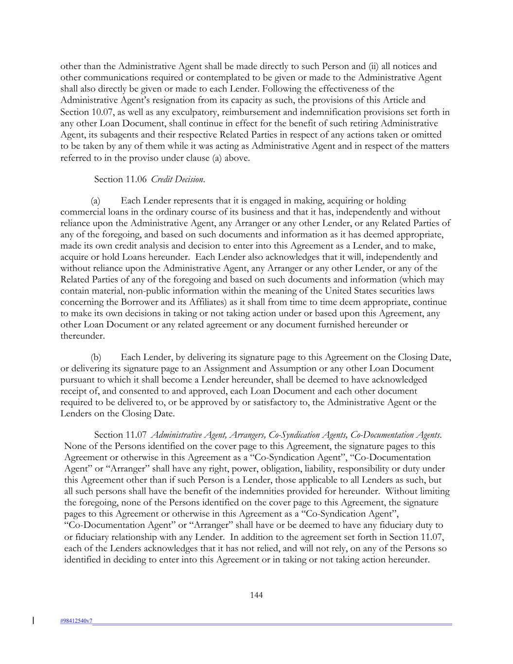 other than the Administrative Agent shall be made directly to such Person and (ii) all notices and other communications required or contemplated to be given or made to the Administrative Agent shall also directly be given or made to each Lender. Following the effectiveness of the Administrative Agent’s resignation from its capacity as such, the provisions of this Article and Section 10.07, as well as any exculpatory, reimbursement and indemnification provisions set forth in any other Loan Document, shall continue in effect for the benefit of such retiring Administrative Agent, its subagents and their respective Related Parties in respect of any actions taken or omitted to be taken by any of them while it was acting as Administrative Agent and in respect of the matters referred to in the proviso under clause (a) above. Section 11.06 Credit Decision. (a) Each Lender represents that it is engaged in making, acquiring or holding commercial loans in the ordinary course of its business and that it has, independently and without reliance upon the Administrative Agent, any Arranger or any other Lender, or any Related Parties of any of the foregoing, and based on such documents and information as it has deemed appropriate, made its own credit analysis and decision to enter into this Agreement as a Lender, and to make, acquire or hold Loans hereunder. Each Lender also acknowledges that it will, independently and without reliance upon the Administrative Agent, any Arranger or any other Lender, or any of the Related Parties of any of the foregoing and based on such documents and information (which may contain material, non-public information within the meaning of the United States securities laws concerning the Borrower and its Affiliates) as it shall from time to time deem appropriate, continue to make its own decisions in taking or not taking action under or based upon this Agreement, any other Loan Document or any related agreement or any document furnished hereunder or thereunder. (b) Each Lender, by delivering its signature page to this Agreement on the Closing Date, or delivering its signature page to an Assignment and Assumption or any other Loan Document pursuant to which it shall become a Lender hereunder, shall be deemed to have acknowledged receipt of, and consented to and approved, each Loan Document and each other document required to be delivered to, or be approved by or satisfactory to, the Administrative Agent or the Lenders on the Closing Date. Section 11.07 Administrative Agent, Arrangers, Co-Syndication Agents, Co-Documentation Agents. None of the Persons identified on the cover page to this Agreement, the signature pages to this Agreement or otherwise in this Agreement as a “Co-Syndication Agent”, “Co-Documentation Agent” or “Arranger” shall have any right, power, obligation, liability, responsibility or duty under this Agreement other than if such Person is a Lender, those applicable to all Lenders as such, but all such persons shall have the benefit of the indemnities provided for hereunder. Without limiting the foregoing, none of the Persons identified on the cover page to this Agreement, the signature pages to this Agreement or otherwise in this Agreement as a “Co-Syndication Agent”, “Co-Documentation Agent” or “Arranger” shall have or be deemed to have any fiduciary duty to or fiduciary relationship with any Lender. In addition to the agreement set forth in Section 11.07, each of the Lenders acknowledges that it has not relied, and will not rely, on any of the Persons so identified in deciding to enter into this Agreement or in taking or not taking action hereunder. 144 #98412540v7