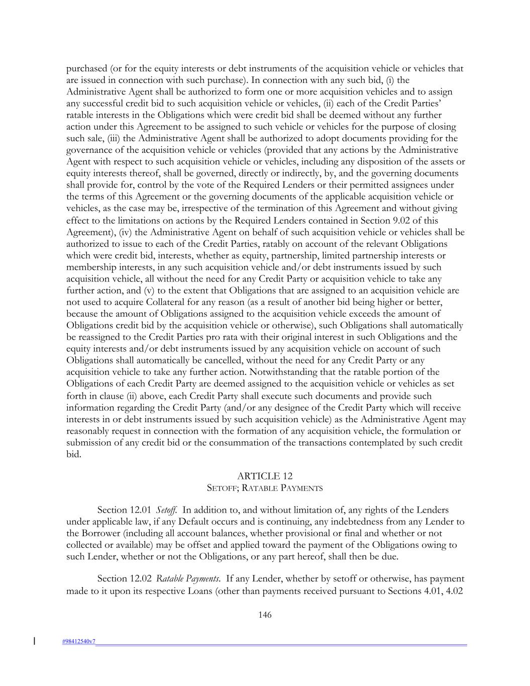 purchased (or for the equity interests or debt instruments of the acquisition vehicle or vehicles that are issued in connection with such purchase). In connection with any such bid, (i) the Administrative Agent shall be authorized to form one or more acquisition vehicles and to assign any successful credit bid to such acquisition vehicle or vehicles, (ii) each of the Credit Parties’ ratable interests in the Obligations which were credit bid shall be deemed without any further action under this Agreement to be assigned to such vehicle or vehicles for the purpose of closing such sale, (iii) the Administrative Agent shall be authorized to adopt documents providing for the governance of the acquisition vehicle or vehicles (provided that any actions by the Administrative Agent with respect to such acquisition vehicle or vehicles, including any disposition of the assets or equity interests thereof, shall be governed, directly or indirectly, by, and the governing documents shall provide for, control by the vote of the Required Lenders or their permitted assignees under the terms of this Agreement or the governing documents of the applicable acquisition vehicle or vehicles, as the case may be, irrespective of the termination of this Agreement and without giving effect to the limitations on actions by the Required Lenders contained in Section 9.02 of this Agreement), (iv) the Administrative Agent on behalf of such acquisition vehicle or vehicles shall be authorized to issue to each of the Credit Parties, ratably on account of the relevant Obligations which were credit bid, interests, whether as equity, partnership, limited partnership interests or membership interests, in any such acquisition vehicle and/or debt instruments issued by such acquisition vehicle, all without the need for any Credit Party or acquisition vehicle to take any further action, and (v) to the extent that Obligations that are assigned to an acquisition vehicle are not used to acquire Collateral for any reason (as a result of another bid being higher or better, because the amount of Obligations assigned to the acquisition vehicle exceeds the amount of Obligations credit bid by the acquisition vehicle or otherwise), such Obligations shall automatically be reassigned to the Credit Parties pro rata with their original interest in such Obligations and the equity interests and/or debt instruments issued by any acquisition vehicle on account of such Obligations shall automatically be cancelled, without the need for any Credit Party or any acquisition vehicle to take any further action. Notwithstanding that the ratable portion of the Obligations of each Credit Party are deemed assigned to the acquisition vehicle or vehicles as set forth in clause (ii) above, each Credit Party shall execute such documents and provide such information regarding the Credit Party (and/or any designee of the Credit Party which will receive interests in or debt instruments issued by such acquisition vehicle) as the Administrative Agent may reasonably request in connection with the formation of any acquisition vehicle, the formulation or submission of any credit bid or the consummation of the transactions contemplated by such credit bid. ARTICLE 12 SETOFF; RATABLE PAYMENTS Section 12.01 Setoff. In addition to, and without limitation of, any rights of the Lenders under applicable law, if any Default occurs and is continuing, any indebtedness from any Lender to the Borrower (including all account balances, whether provisional or final and whether or not collected or available) may be offset and applied toward the payment of the Obligations owing to such Lender, whether or not the Obligations, or any part hereof, shall then be due. Section 12.02 Ratable Payments. If any Lender, whether by setoff or otherwise, has payment made to it upon its respective Loans (other than payments received pursuant to Sections 4.01, 4.02 146 #98412540v7