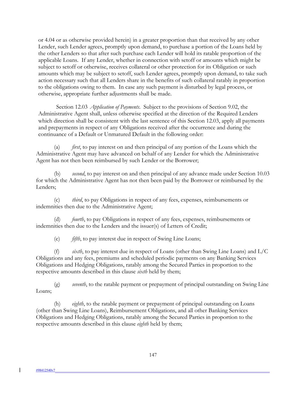 or 4.04 or as otherwise provided herein) in a greater proportion than that received by any other Lender, such Lender agrees, promptly upon demand, to purchase a portion of the Loans held by the other Lenders so that after such purchase each Lender will hold its ratable proportion of the applicable Loans. If any Lender, whether in connection with setoff or amounts which might be subject to setoff or otherwise, receives collateral or other protection for its Obligation or such amounts which may be subject to setoff, such Lender agrees, promptly upon demand, to take such action necessary such that all Lenders share in the benefits of such collateral ratably in proportion to the obligations owing to them. In case any such payment is disturbed by legal process, or otherwise, appropriate further adjustments shall be made. Section 12.03 Application of Payments. Subject to the provisions of Section 9.02, the Administrative Agent shall, unless otherwise specified at the direction of the Required Lenders which direction shall be consistent with the last sentence of this Section 12.03, apply all payments and prepayments in respect of any Obligations received after the occurrence and during the continuance of a Default or Unmatured Default in the following order: (a) first, to pay interest on and then principal of any portion of the Loans which the Administrative Agent may have advanced on behalf of any Lender for which the Administrative Agent has not then been reimbursed by such Lender or the Borrower; (b) second, to pay interest on and then principal of any advance made under Section 10.03 for which the Administrative Agent has not then been paid by the Borrower or reimbursed by the Lenders; (c) third, to pay Obligations in respect of any fees, expenses, reimbursements or indemnities then due to the Administrative Agent; (d) fourth, to pay Obligations in respect of any fees, expenses, reimbursements or indemnities then due to the Lenders and the issuer(s) of Letters of Credit; (e) fifth, to pay interest due in respect of Swing Line Loans; (f) sixth, to pay interest due in respect of Loans (other than Swing Line Loans) and L/C Obligations and any fees, premiums and scheduled periodic payments on any Banking Services Obligations and Hedging Obligations, ratably among the Secured Parties in proportion to the respective amounts described in this clause sixth held by them; (g) seventh, to the ratable payment or prepayment of principal outstanding on Swing Line Loans; (h) eighth, to the ratable payment or prepayment of principal outstanding on Loans (other than Swing Line Loans), Reimbursement Obligations, and all other Banking Services Obligations and Hedging Obligations, ratably among the Secured Parties in proportion to the respective amounts described in this clause eighth held by them; 147 #98412540v7